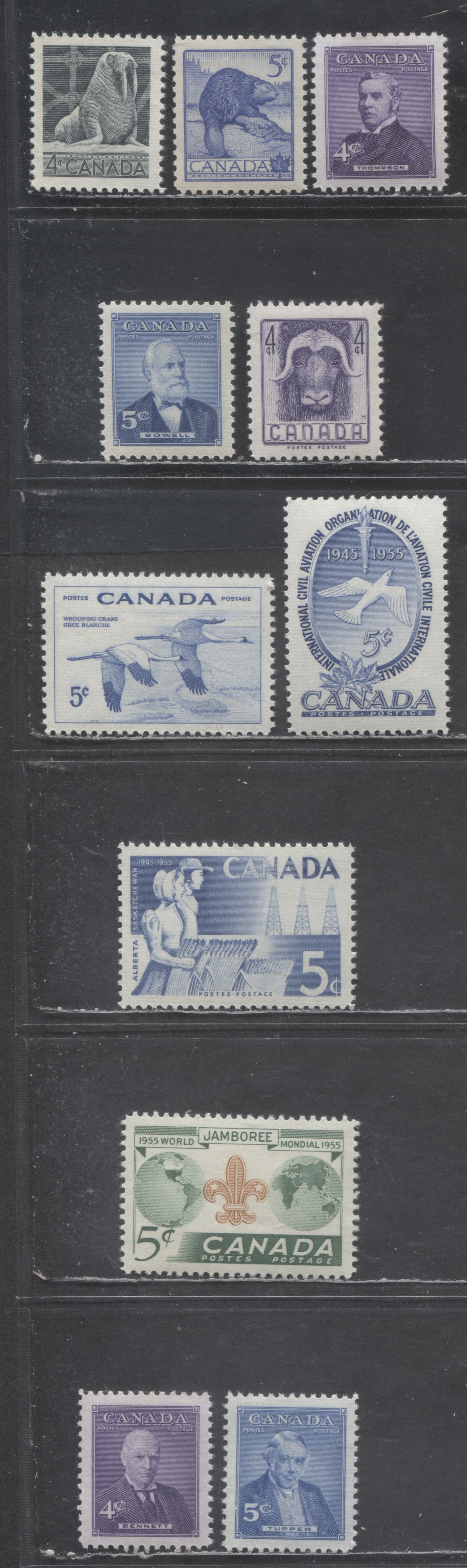 Canada #335-336, 349-350, 352-358 4c-5c Various Colours Various Subjects, 1954-1955 Wildlife Week Issue - Prime Ministers Issue, 11 VFNH Singles, Horizontally & Vertically Ribbed Papers, Cream & Yellowish Cream Gums