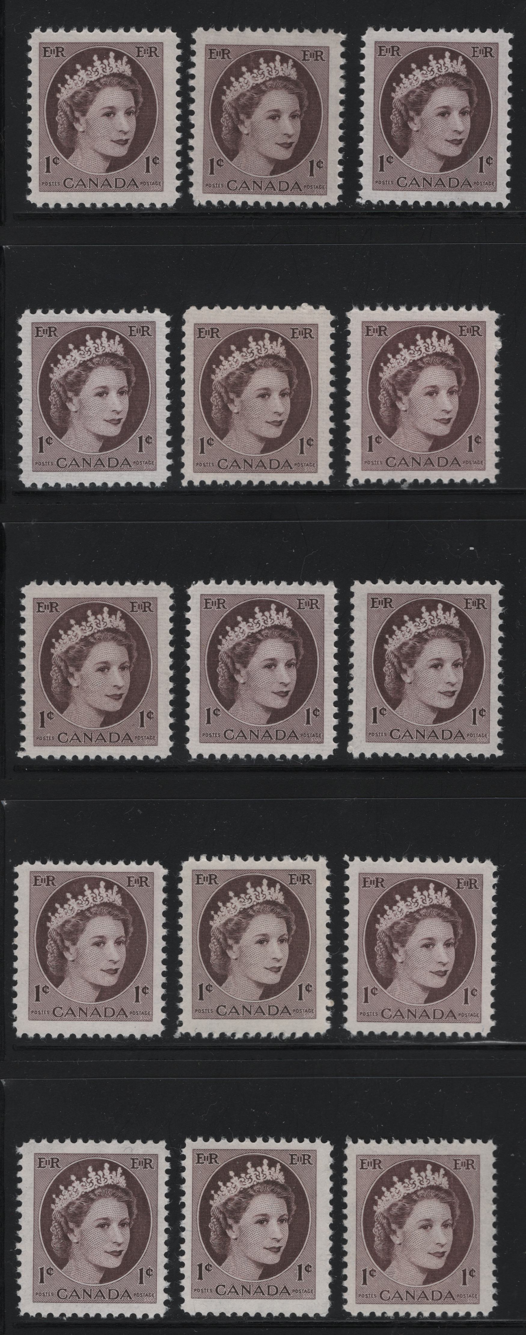 Canada #337 1c Violet Brown, Reddish Violet Brown & Chocolate Brown, 1954-1962 Wilding Issue, 15 VFNH Singles DF1 & DF2 Ribbed/Ribbed, DF1 Ribbed/Smooth, DF1 & DF2 Smooth/Smooth, And DF1 & DF2 Smooth/Ribbed Papers, Various Shades & Gums