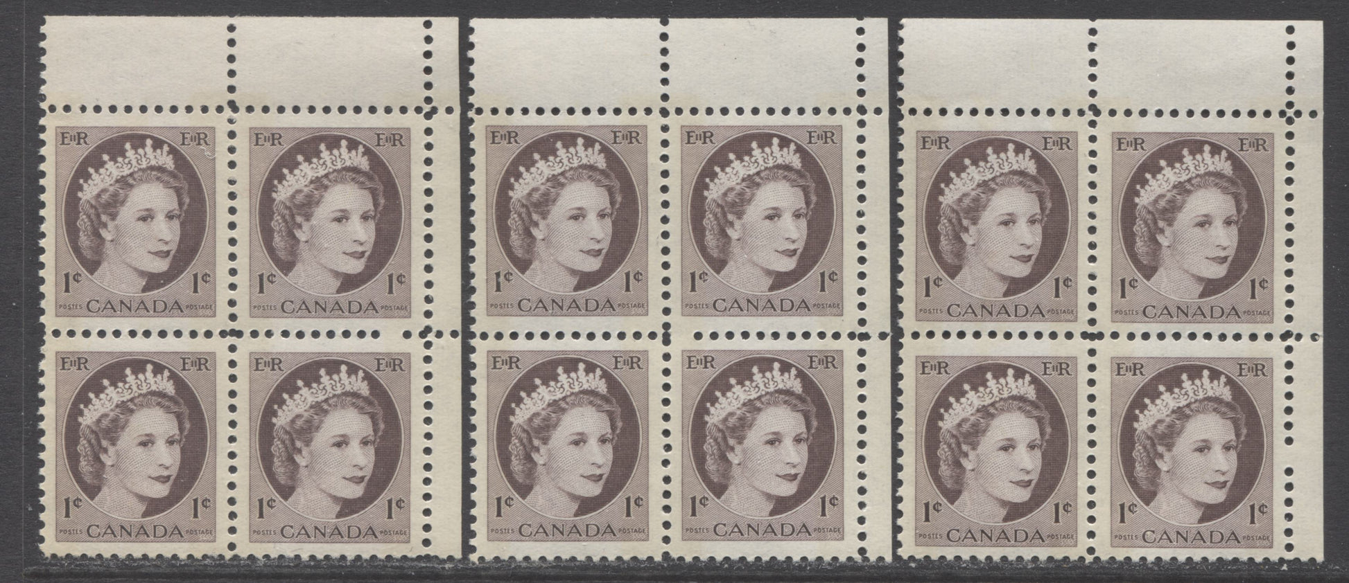 Lot 38 Canada #337p 1c Violet Brown Queen Elizabeth, 1954 Wilding Definitives, 2 VFNH UR Blank Blocks Of 4 On DF Smooth/Ribbed W2B Tagged Paper & Missing Perferation Pins In Two Different Places