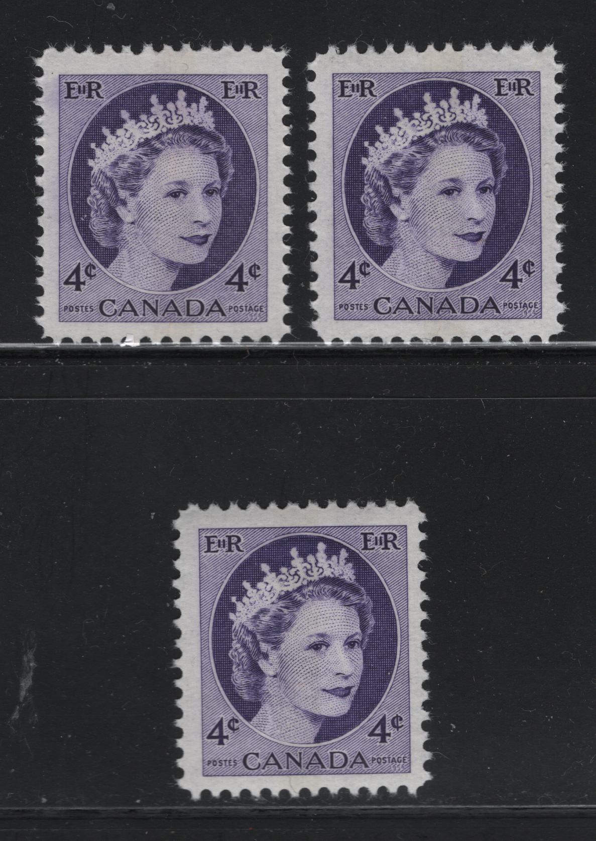 Canada #340p 4c Violet & Dark Violet Queen Elizabeth II, 1954-1962 Wilding Issue, 3 VFNH Singles Near Invisible Winnipeg Tag That Glows Bluish White Under Shortwave UV, On DF1 Greyish Vertical Ribbed & Smooth Papers, Semi-Gloss Gum