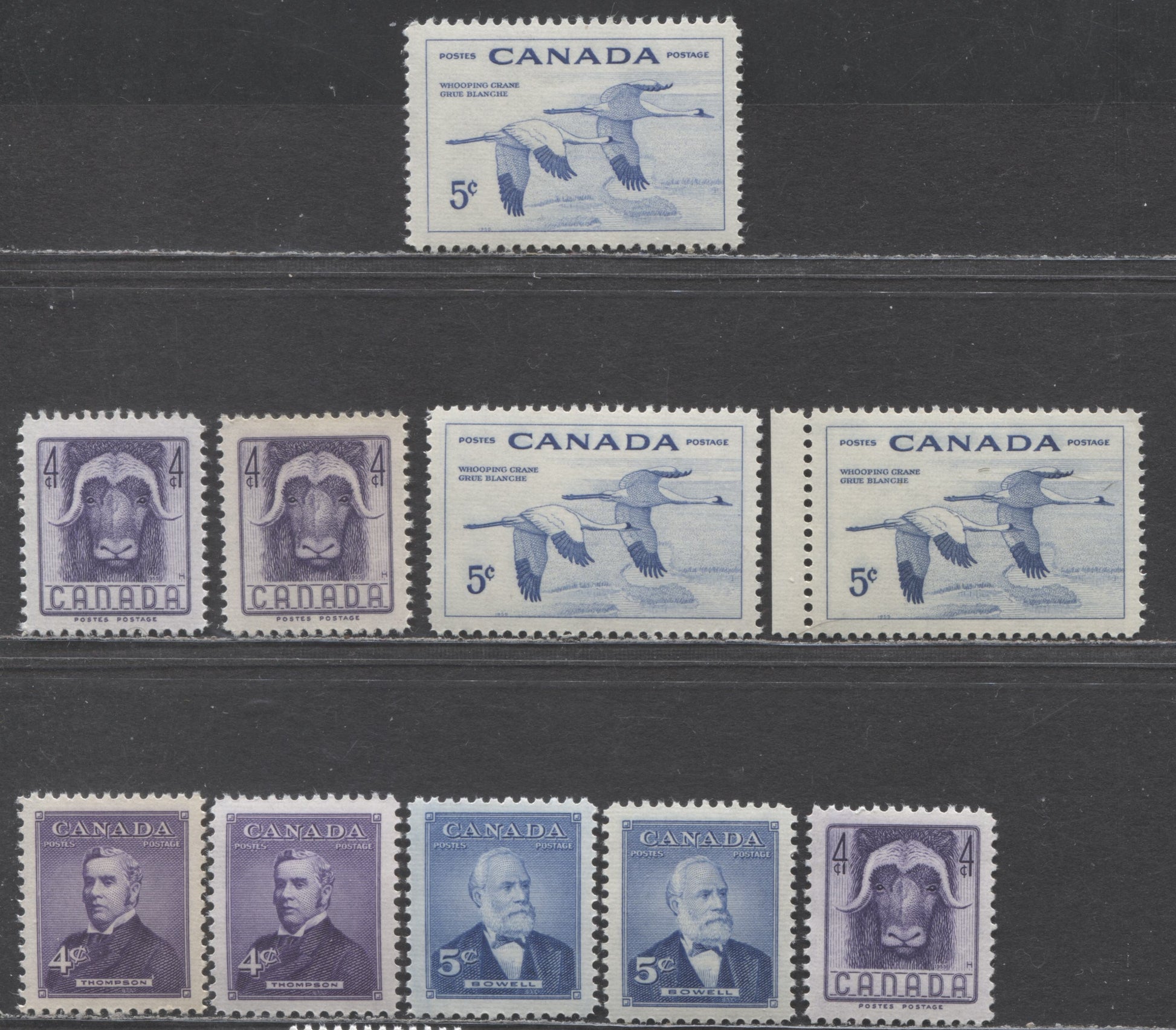 10 VFNH singles of the 4c-5c, 4c-5c violet-bright blue, purple-blue from the 1954-1955 Prime Ministers, Wildlife Issues . Both issues are found on horizontal ribbed paper. The Prime Minister stamps can be found on two types of ribbed paper: one showing the ribbing on both sides & one showing ribbing only on the front. The wildlife stamps appear to be generally all the second type of paper. Shades are found on all values and there are some outstanding ones on the 5c stamps.