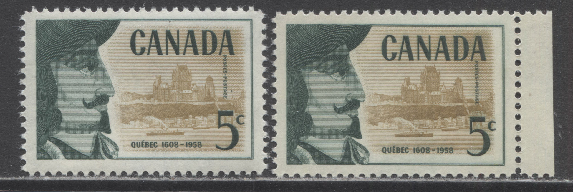 2 VFNH singles of the 5c dark green & bistre brown Champlain from the 1958 Founding Of Quebec with upward & rightward shift of vignette resulting in 1.5mm white space at right & bottom.