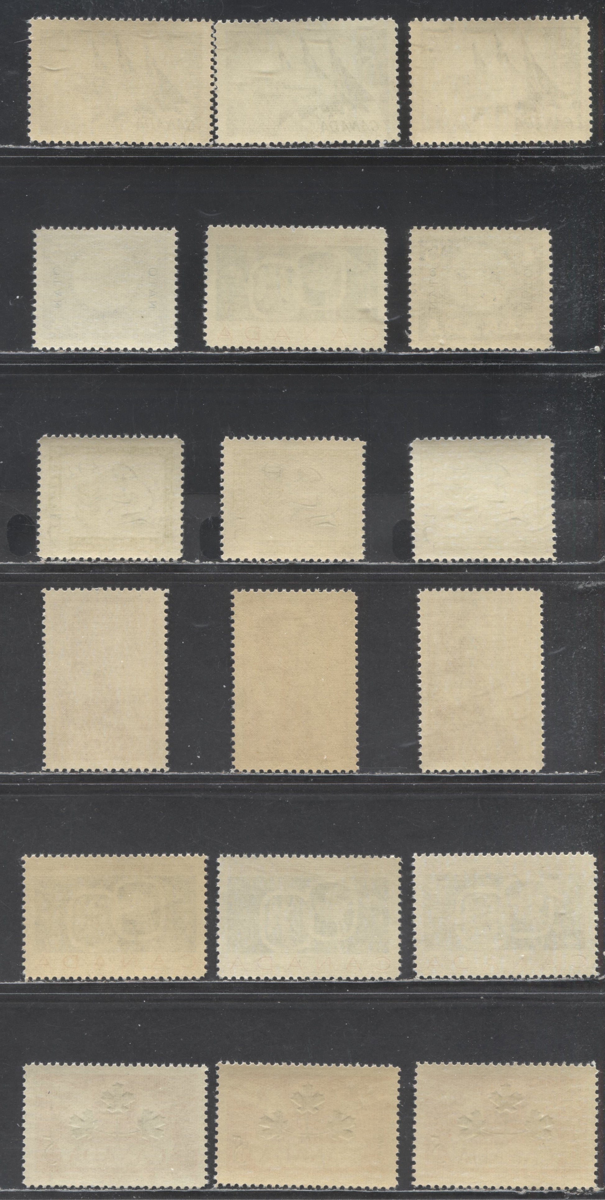 18 VFNH singles of the 5c various colours various subjects from the 1959 Silver Dart - Plains of Abraham Issues. Smooth paper, ribbed on back. Streaky and smooth cream semi-gloss gum, and slightly different shades. All the stamps show subtle to significant shade variations. All of these stamps are on smooth surfaced paper, with horizontal ribbing on the back of all issues except the NATO, Country Women and Plains of Abraham issues, which show vertical ribbing instead. The gum on all the stamps is either smooth or streaky cream gum with a semi-gloss sheen. On several, the gum colour is a deeper cream.