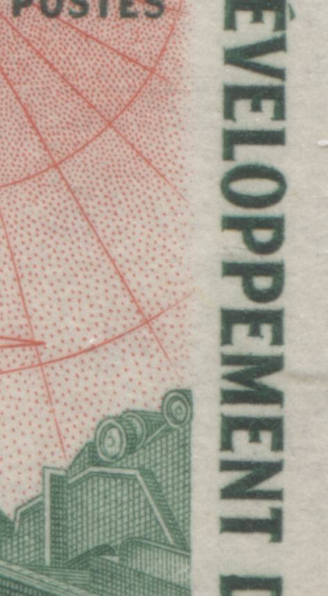 2 VFNH singles of the 5c deep emerald & red Surveying Crew from the 1961 Northern Development Issue. Major leftward vignette shift, NF ribbed paper. On this issue the red map dotted edges will more or less line up with the edges of the surveying crew, with minor, but laregely unnoticeable shifts being somewhat common. However, moderate shifts in the rightward or leftward direction will show this map being noticably out of alignment. This will result in the red dots either falling well short of the right edge of the surveying crew, or protruding out past it. Also, on the normal stamp, the red extends about 1/2 mm to the left of the "P" or "Postage, and about 1 mm to the right of the "S" of "Postes". The example offered here is a very noticeable shift to the left, so that there is only about 1/4 mm of red to the right of "postes" and about 1.25 mm to the left of "Postage".
