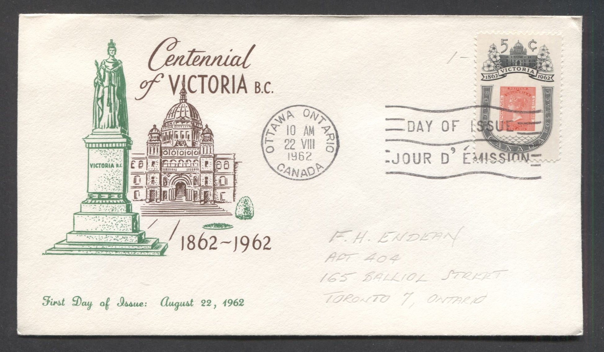 Lot 39 Canada #399iii 5c Black & Rose 1860 BC Stamp 1962 Victoria Centenary, A Personal Cachet FDC's Franked With A Single, Addressed Lightly In Pencil, MF-Fl Paper, Est. Value $30