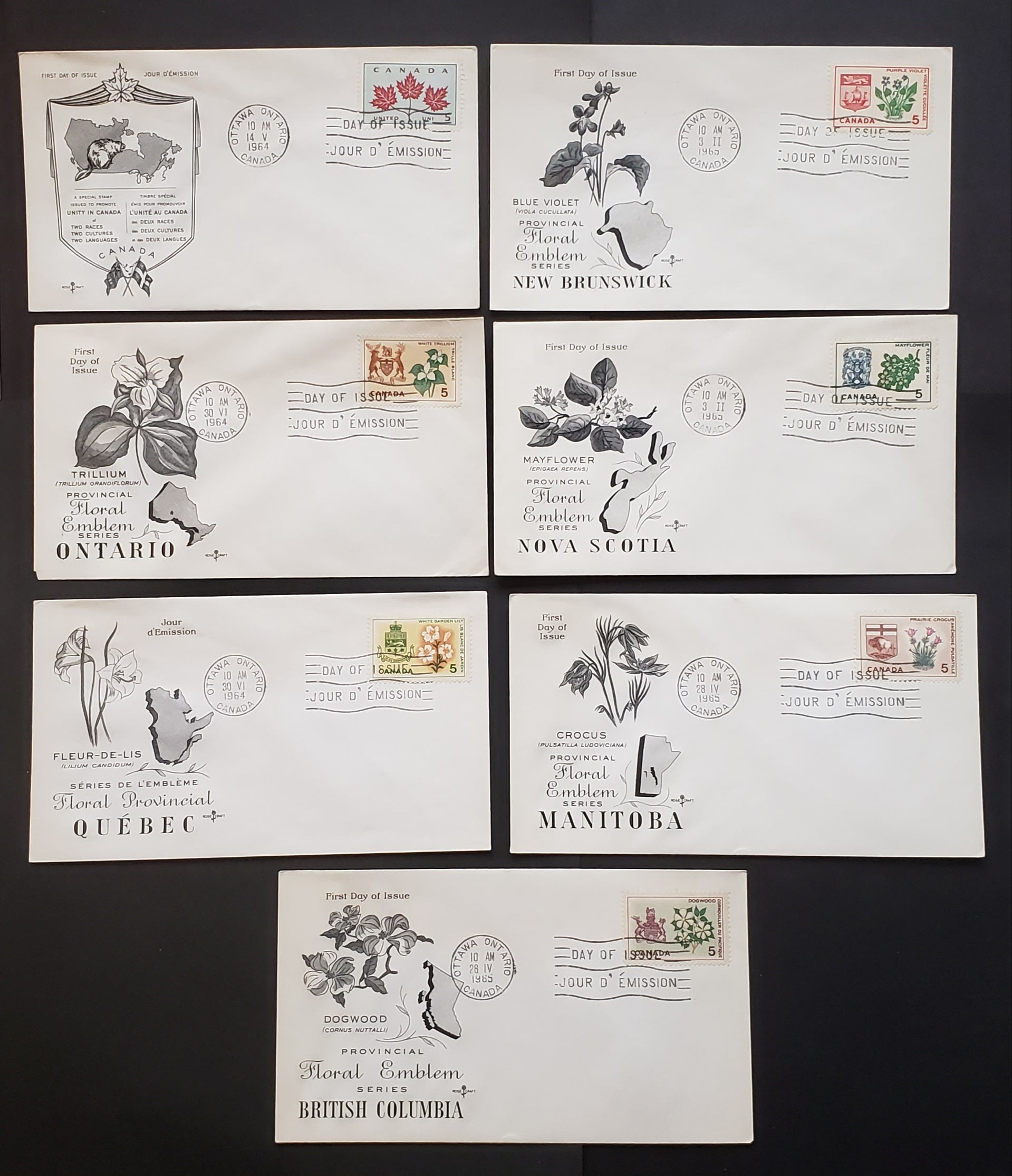 Canada #417-423 5c Multicoloured Unity - Dogwood, 1964-1966 Emblems Issue, 7 VF First Day Covers With Rosecraft Cachets, Unaddressed, Stamps On DF Paper