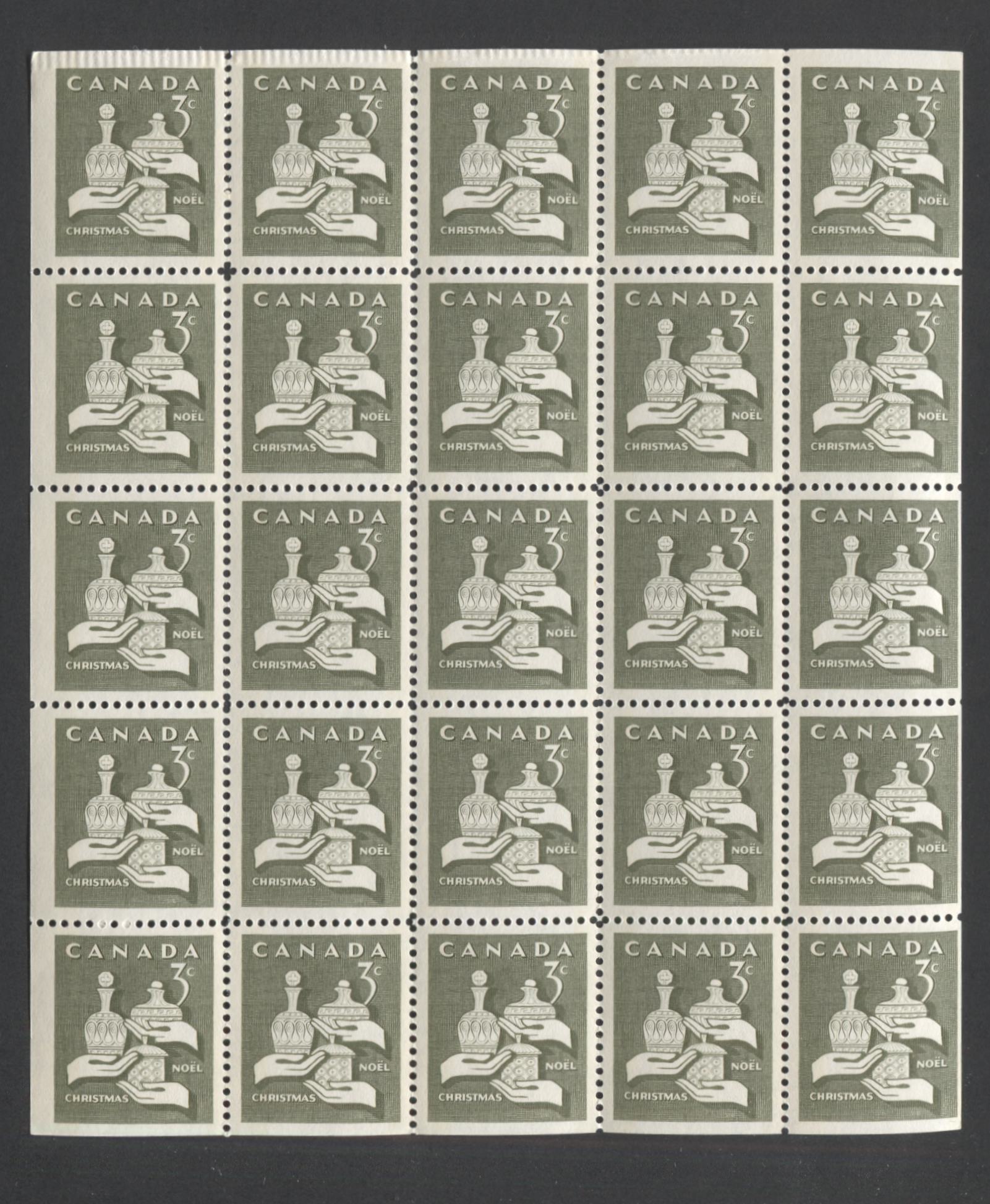 Lot 6 Canada #443q 3c Olive Gifts From The Wise Men, 1965 Christmas, A VFNH Tagged Miniature Pane Of 25 With Bluish White Tagging, 4 Second Afterglow, Crimping Along Top Edge, Streaky Dex