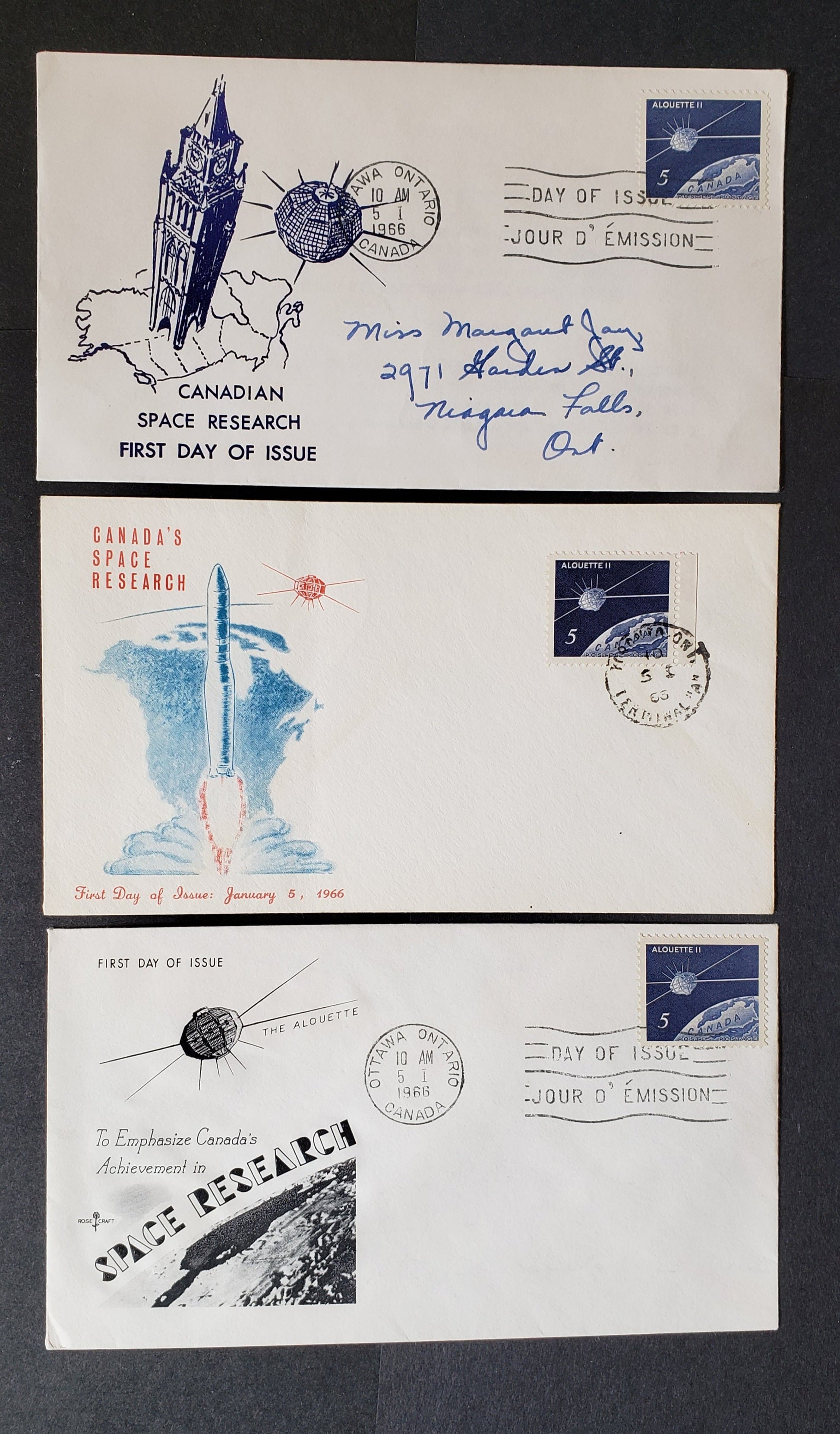 Canada #445 5c Dark Violet Blue Satellite Over Canada 1966 Alouette II, 3 ARC, Personal & Rosecraft Cachets FDC's Franked With Singles, All Addressed Except Rosecraft, Cat. Value $16