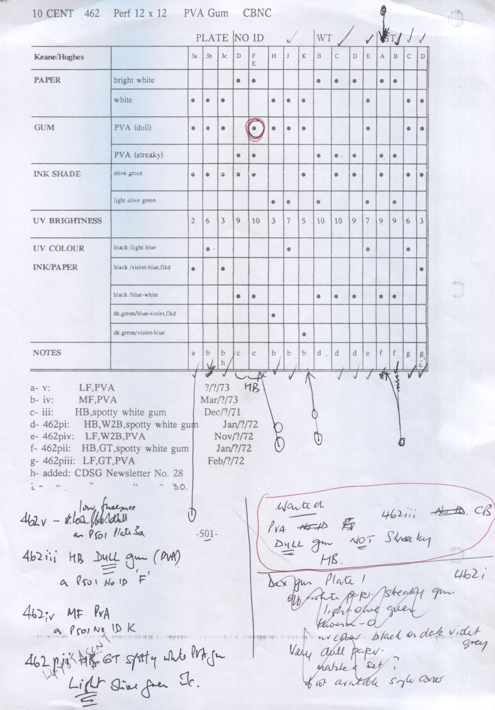 The first attribute, and perhaps the most important is the paper. In addition to the basic fluorescence level, the paper itself can appear different colours under UV light. This becomes most significant when dealing with the dull papers, as the same basic fluorescence level can exist in 4 or 5 different colours under UV. We have included, with each of the listings the tables from the Keane and Hughes book on this issue as we find that they do the best job of capturing the differences that exist. The only departure we have made from their tables is in the assessment of fluorescence level. Keane and Hughes assign a level of 0 to all the dull papers and to our way of thinking this is not accurate. We follow the Irwin-Freeman 12 point scale in which 0 is dead, 1-2 is dull, 3-4 is LF, 5 is F, 6-7 is MF, 8-9 is HF and HB is 10-12. So, under this scale a lot of what K&H rate as 0 are actually a 1 or a 2, and this is how we describe them in our listings. Also, we note that the paper used for many of the PVA gum printings is horizontally ribbed on the higher values. We see two principal types pf paper for these printings, with one being quite thin and the other having a slightly plasticized quality to it, which often results in unpunched perfs, probably due to some additive in the paper that makes it difficult to punch through. The paper on the dex gum and spotty white gum printings can be found with distinct, but light vertical ribbing, which is mostly visible on the gum side.