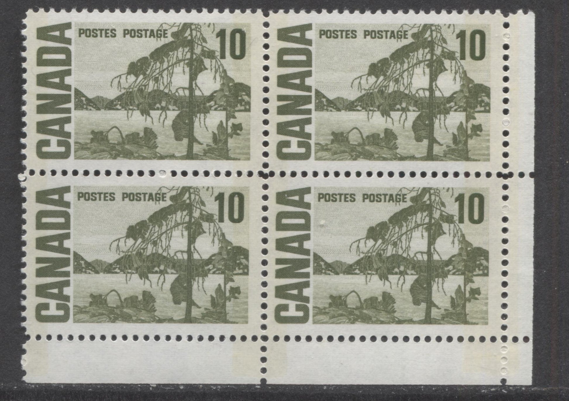 Lot 93 Canada #462piv 10c Bright Yellowish Green Jack Pine, 1967-1973 Centennial High Values, A VFNH LR W2B Tagged Field Stock Block Of 4 On MF7 Bluish White Paper, Ink Appears Black Under UV, Matte PVA Gum & Light Creamy Yellow Tagging