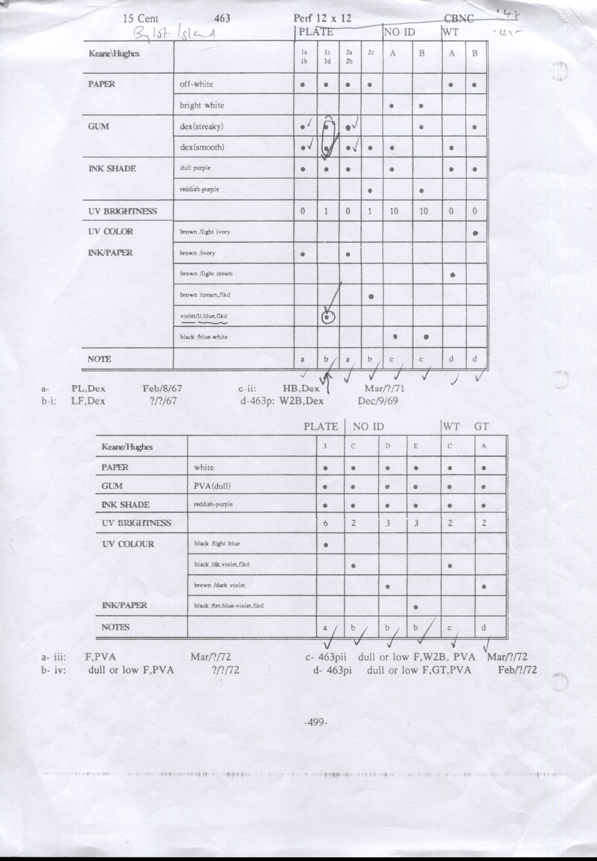 The first attribute, and perhaps the most important is the paper. In addition to the basic fluorescence level, the paper itself can appear different colours under UV light. This becomes most significant when dealing with the dull papers, as the same basic fluorescence level can exist in 4 or 5 different colours under UV. We have included, with each of the listings the tables from the Keane and Hughes book on this issue as we find that they do the best job of capturing the differences that exist. The only departure we have made from their tables is in the assessment of fluorescence level. Keane and Hughes assign a level of 0 to all the dull papers and to our way of thinking this is not accurate. We follow the Irwin-Freeman 12 point scale in which 0 is dead, 1-2 is dull, 3-4 is LF, 5 is F, 6-7 is MF, 8-9 is HF and HB is 10-12. So, under this scale a lot of what K&H rate as 0 are actually a 1 or a 2, and this is how we describe them in our listings. Also, we note that the paper used for many of the PVA gum printings is horizontally ribbed on the higher values. We see two principal types pf paper for these printings, with one being quite thin and the other having a slightly plasticized quality to it, which often results in unpunched perfs, probably due to some additive in the paper that makes it difficult to punch through. The paper on the dex gum and spotty white gum printings can be found with distinct, but light vertical ribbing, which is mostly visible on the gum side.