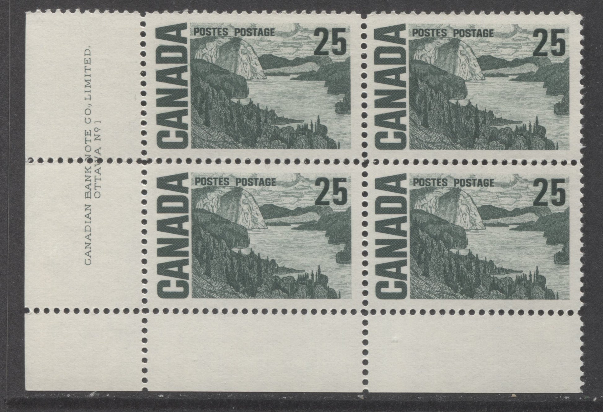 Canada #465 25c Deep Gray Green Solemn Land, 1967-1973 Centennial High Values, A VFNH LL Plate 1 Block Of 4 On DF-fl Paper With Streaky Dex Gum, Greenish Under UV