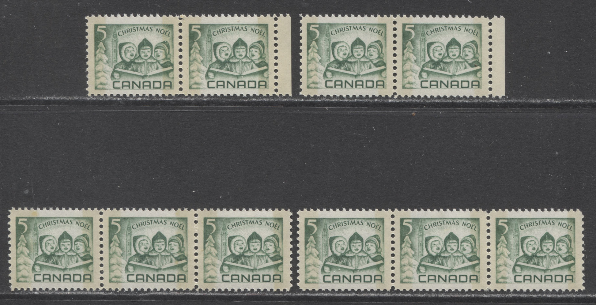Lot 24 Canada #477p 5c Green Children Carolling, 1967 Christmas, 4 VFNH Margin Pairs & Stips Of 4 With Different Tag Bar Widths, Speckled Fluorescent Papers, Bluish White Tagging, Smooth Dex Gum