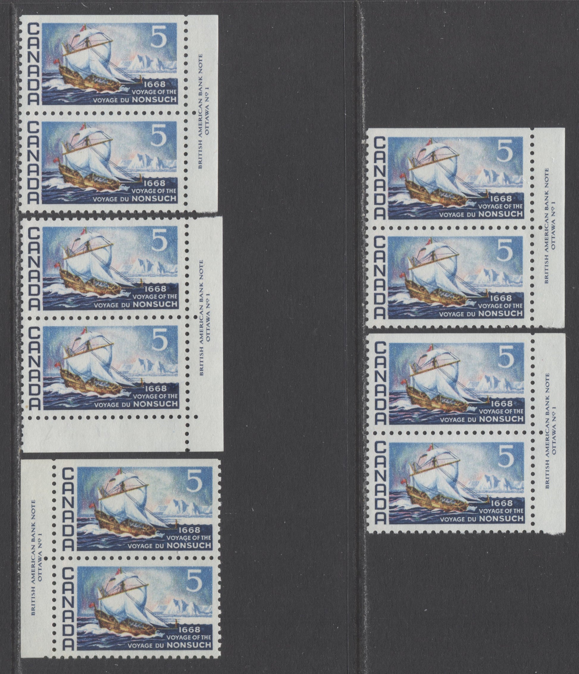 Canada #482var 5c Dark Blue & Multicolored Nonsuch, 1968 Voyage Of The Nonsuch, 5 VFNH Plate Inscription Pairs On NF, DF & Non Flecked Papers