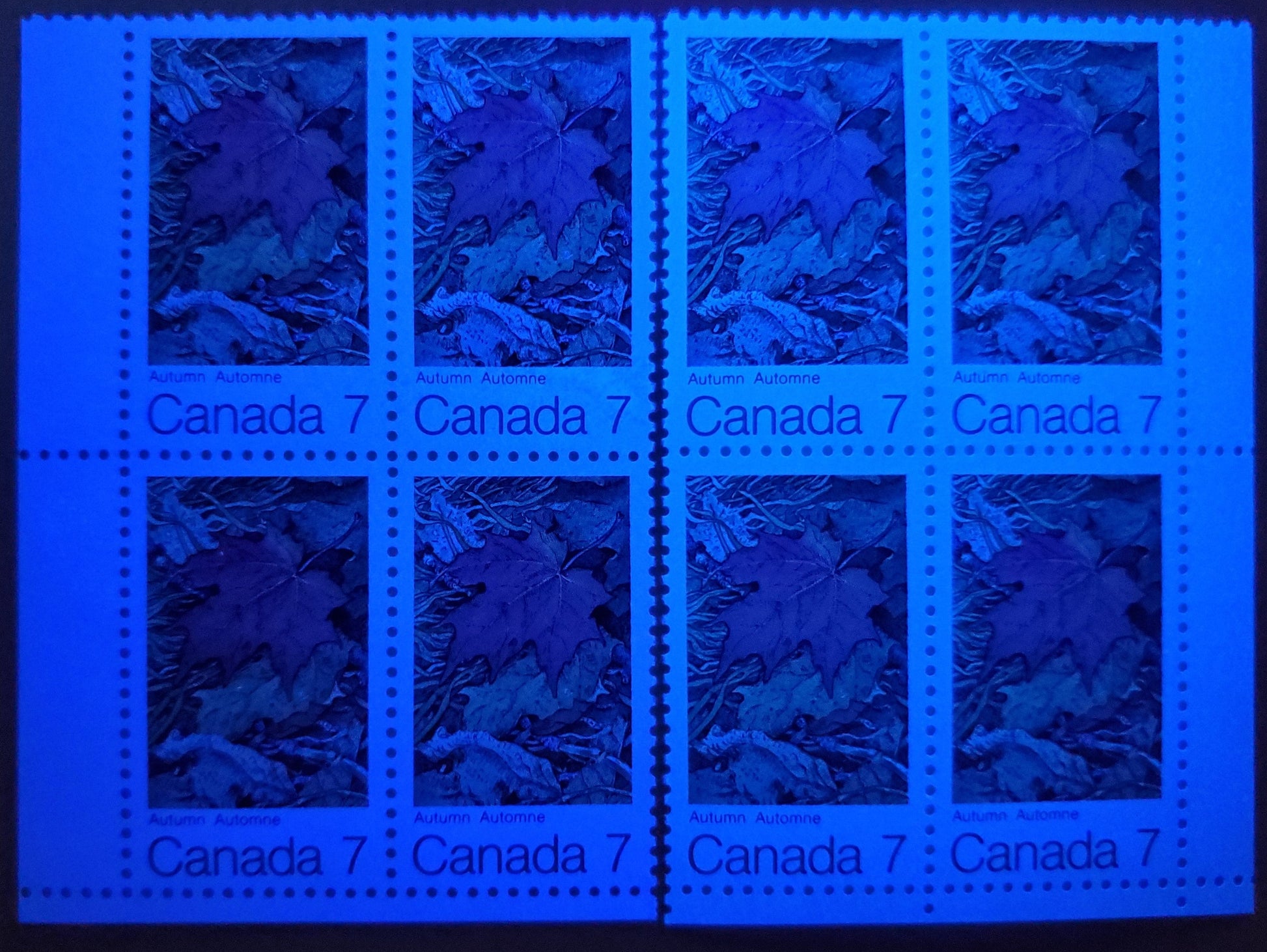 In describing fluorescence on these issues and all the stamps issued after 1970, it is critical to understand the Irwin-Freeman scale of fluorescence, which ranges from 0 to 12 and that a particular designation like say HB or HF will correspond to more than one fluorescence level. One pitfall that many collectors fall into is to compare the papers, rank the fluorescent reactions from low to high and then try to force them into the DF/LF/MF/HF and HB nomenclature, rather than recognizing that three different levels of reaction may actually correspond to the same designation. This is why Unitrade's listings for this period are so confusing. Generally HB corresponds to levels 10 through 12; HF, levels 8 and 9; MF, levels 7 and 6; F, level 5; LF, levels 3 and 4; DF, levels 1 and 2 and finally NF corresponds to 0.