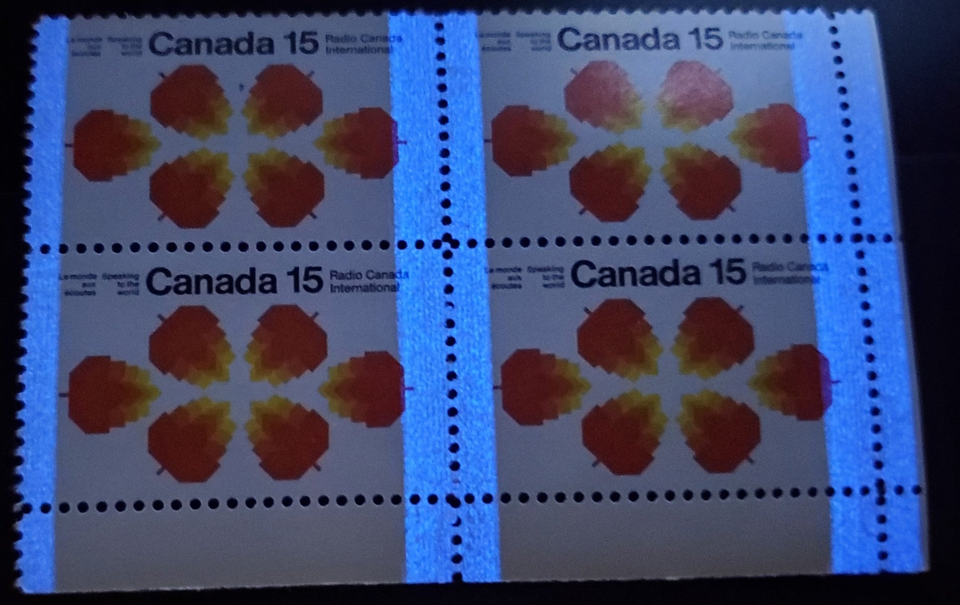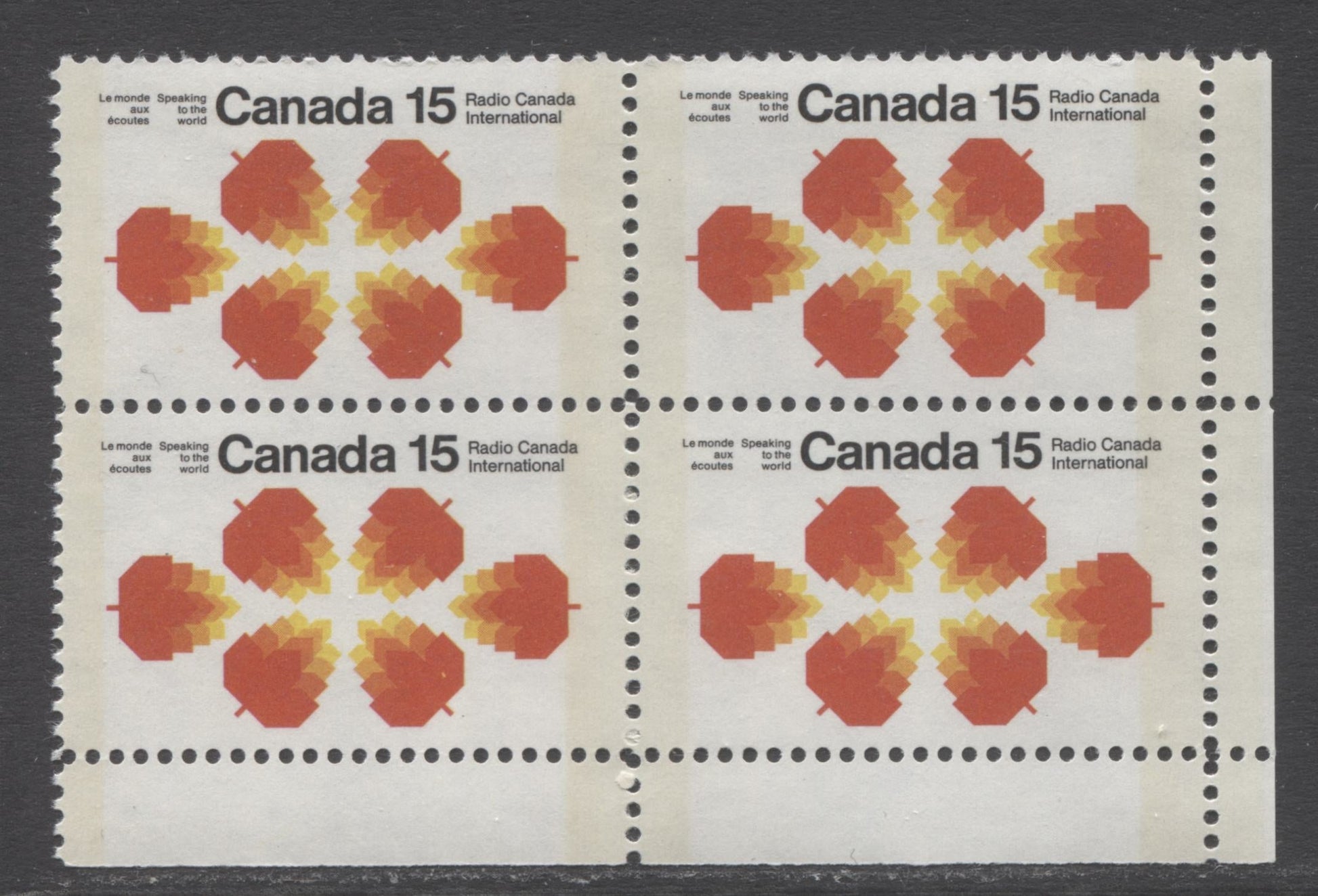 A VFNH LR block of 4 of the 15c black, red orange & yellow Maple Leaves from the 1971 Radio Canada International Issue W2B HB paper with spotty white gum, bluish white tagging, 8 second after glow.
