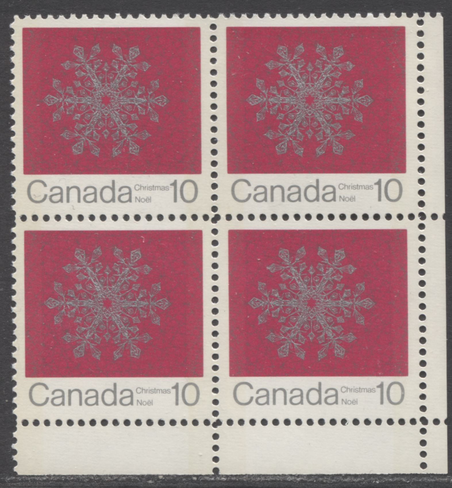 Lot 35 Canada #556pi 10c Deep Carmine And Silver, 1971 Christmas - Snowflakes Issue, A VFNH LR Block Of 4 W2B On HF Horizontal Ribbed Paper