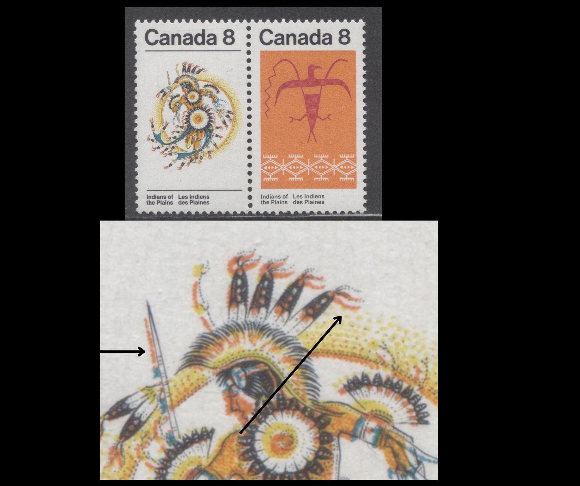 A VFNH pair of the 8c multicoloured Sun Dance & Thunderbird from the 1972 Plains Indians Issue rightward shift of black, DF2/NF vertical ribbed paper. This issue was printed by BABN using photogravure and engraving on paper that was supposed to be coated with chalk. Initial printings had the chalk coating vertically ribbed, most likely to improve the absorption of cancellation ink. Later printings were on paper that had a smooth chalky coating. These are FAR scarcer than the vertically ribbed stamps, often by a factor of more than 100:1. One printing of this issue, and the 1973 Algonkian issue was made on a MF uncoated paper (ribbed on this issue only), and is extremely rare on this issue, with only 2.5 pairs being found so far. Some prominent colour shifts are found, which show that the photogravure colours appear to have been printed separately, with the engraving being printed afterwards. While there are not a lot of varieties on these stamps, there are a few that can be collected. Unitrade's listings for fluorescence on these are woefully inadequate in 2 respects. Firstly, the readings on the front and back are usually different, and not just one overall fluorescence level, and many levels exist other than what is listed. On the front the common fluorescence level is DF2, which is close to LF, and either DF1 or DF1 with very sparse LF flecks on the back. In addition LF3 and LF3-flecked can be found on the back as well as NF. For the vertical ribbed papers anything that is NF as opposed to DF is scarcer, as is anything that is higher than DF2.