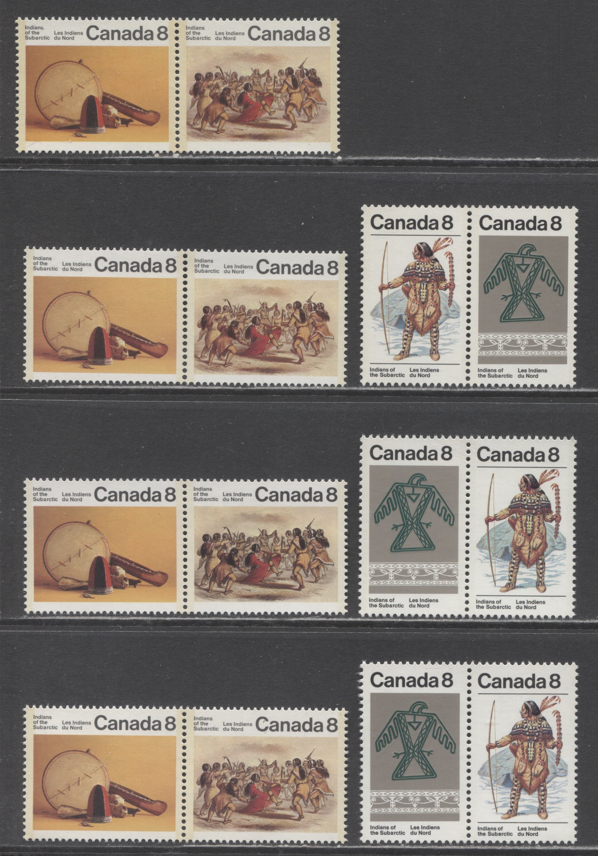 Canada #575a, ai, 577a 8c Multicoloured Various Designs, 1975 Subarctic Indians Issue, 7 VFNH Pairs MF/HF, HF/MF, HF/HF Cream & Bright White Papers, Light & Dark Tags, Different Shade Varieties