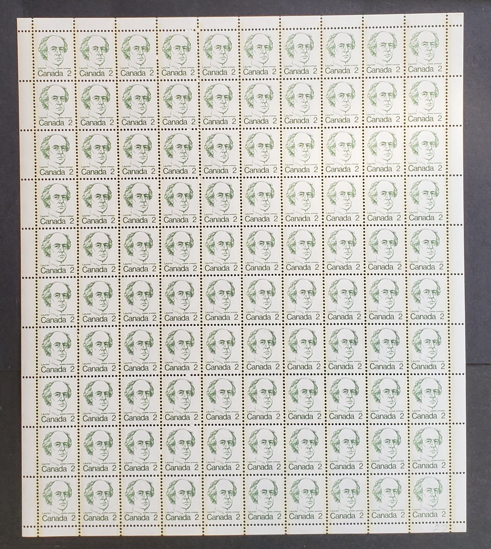 A VFNH full field stock sheet of 100 of the 2c green Laurier from the 1973-1976 Caricature Definitives Issue on DF/DF paper with light yellowish cream tagging.