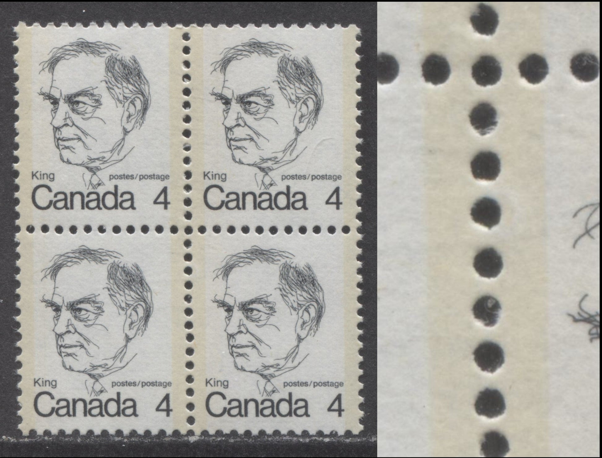 Canada #588var 4c Black William Lyon MacKenzie King, 1973-1978 Caricature Issue, A VFNH Block Of 4 Showing Flaw In Tagging Between Lower Stamps, LF3/LF3 Vertical Ribbed Paper, Light Tagging, Eggshell PVA Gum
