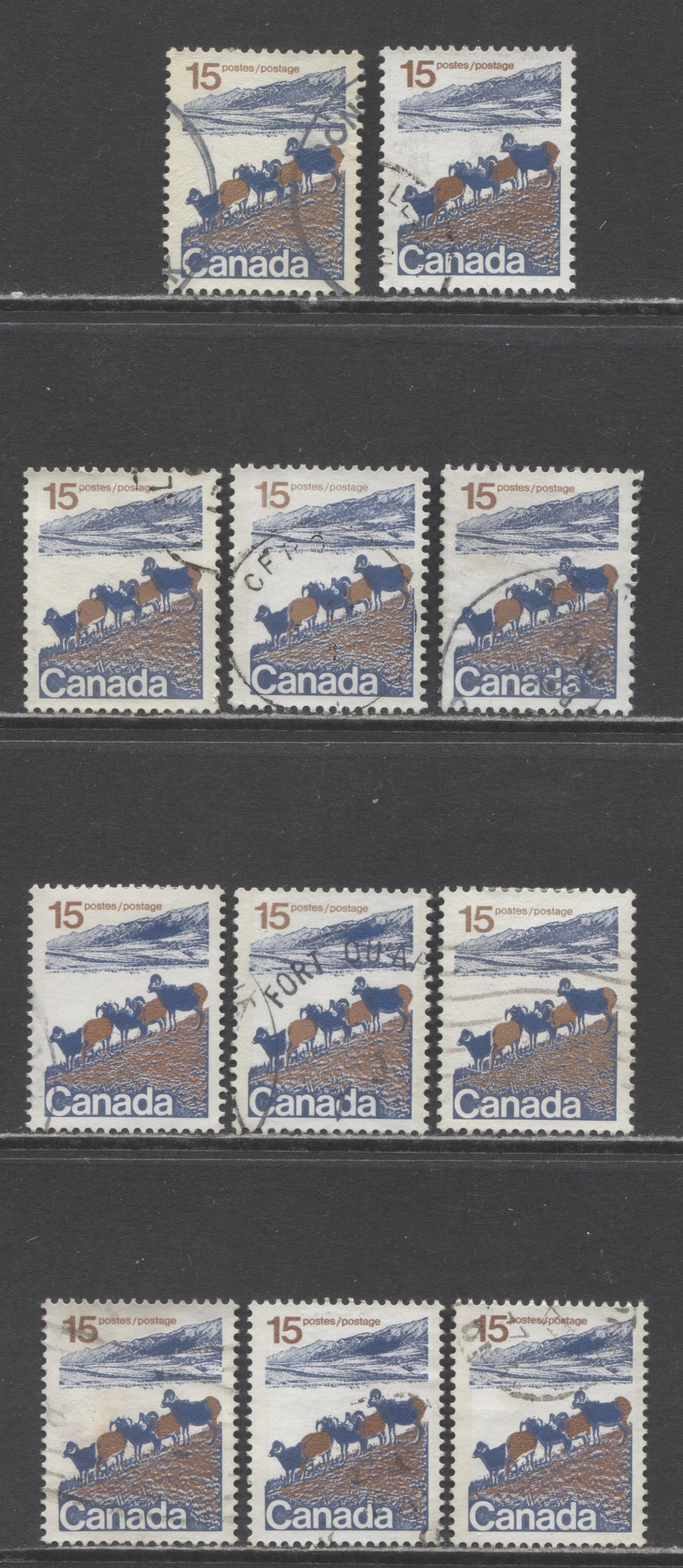 11 VF used singles of the 15c multicoloured Mountain Sheep from the 1972-1979 Landscape Definitive Issue nearly complete run of type 1&2 printings, excluding two perf. 12.5 x 12 type 2's , but including NF type 2, perf. 12.5 x 12. Includes: (1) DF1/DF1 vertical ribbed paper, bluish white OP-4 tagging; (2) DF1/DF1 vertical ribbed paper, bluish white W2B tagging; (3) DF2/LF3 smooth paper, 2.75 mm OP-2 tagging; (4) as (3) but 3 mm tagging, semi-solid background; (5) as (3) but 3 mm tagging, solid background; (6) DF1/DF2 vertical ribbed paper, 3 mm OP-2 tagging; (7) type 2, perf. 12.5 x 12, DF1/DF1 smooth paper, nearly solid background; (8) type 2, perf. 13.3, DF1/DF2. solid background; (9) type 2, perf. 13.3, DF1/LF3 paper; (10) type 2, perf. 13.3, LF3/F paper; (11) type 2, perf. 13.3, LF3/MF7-fl paper.