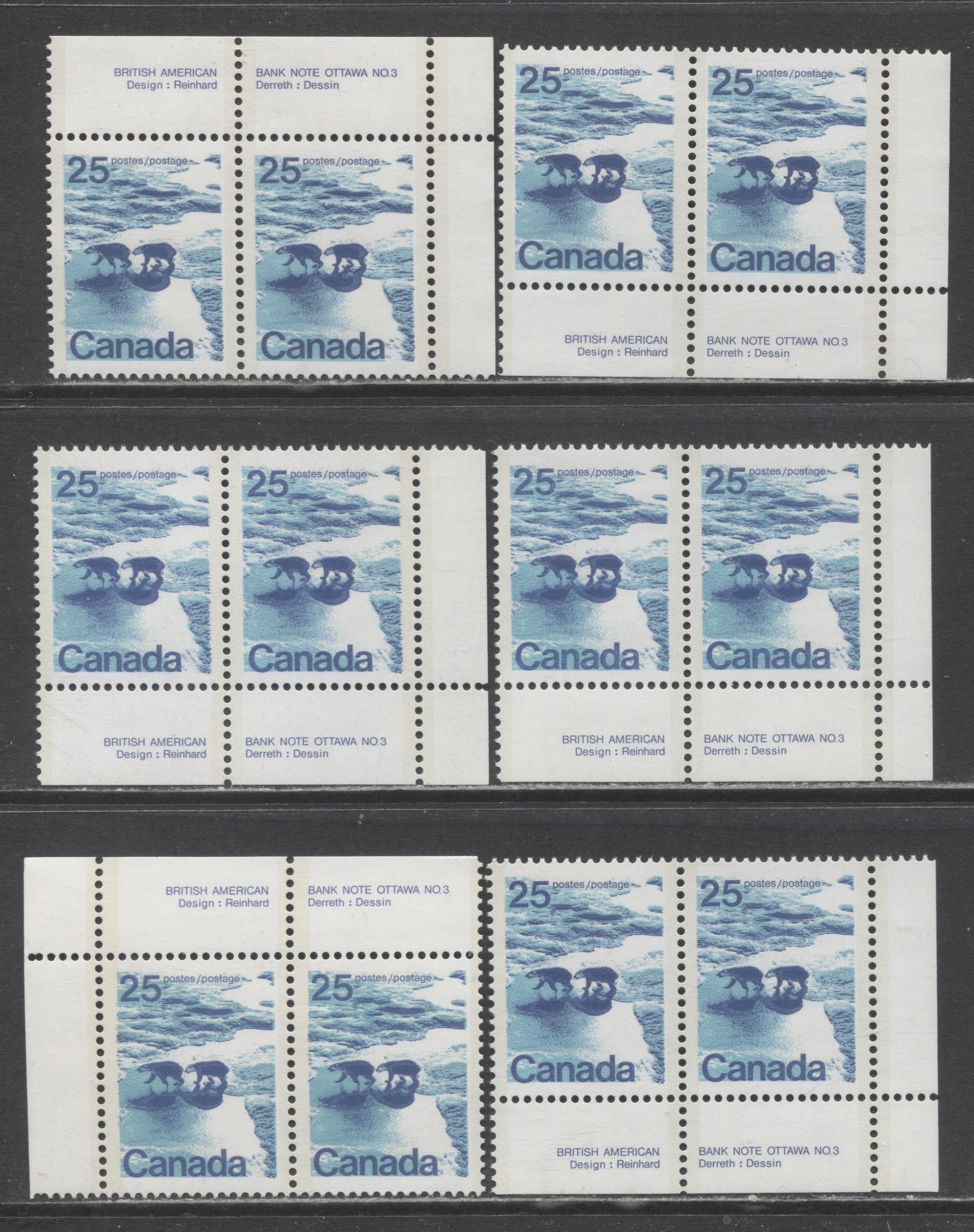 Canada #597a-597aii 25c Multicoloured Polar Bears, 1972 - 1977 Landscape Definitives Issue, 6 VFNH Plate Pairs Type 2 Perf 13.3 On Different DF/LF, NF/NF & DF/MF Papers. Baby Blue Water