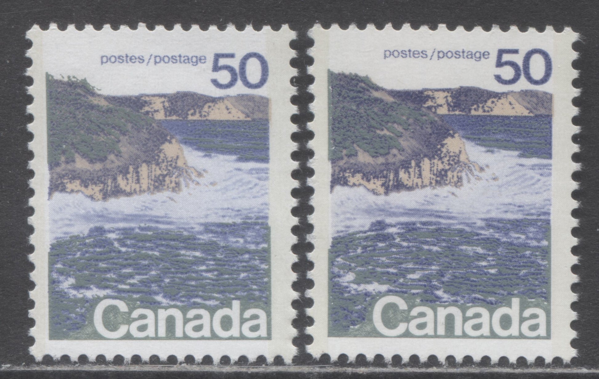 Canada #598iii, vii 50c Multicoloured Seashore, 1972-1979 Landscape Definitive Issue, 2 VFNH Singles Type 2, Perf. 12.5 x 12, LF3/MF6 & DF1/LF3 Smooth Papers
