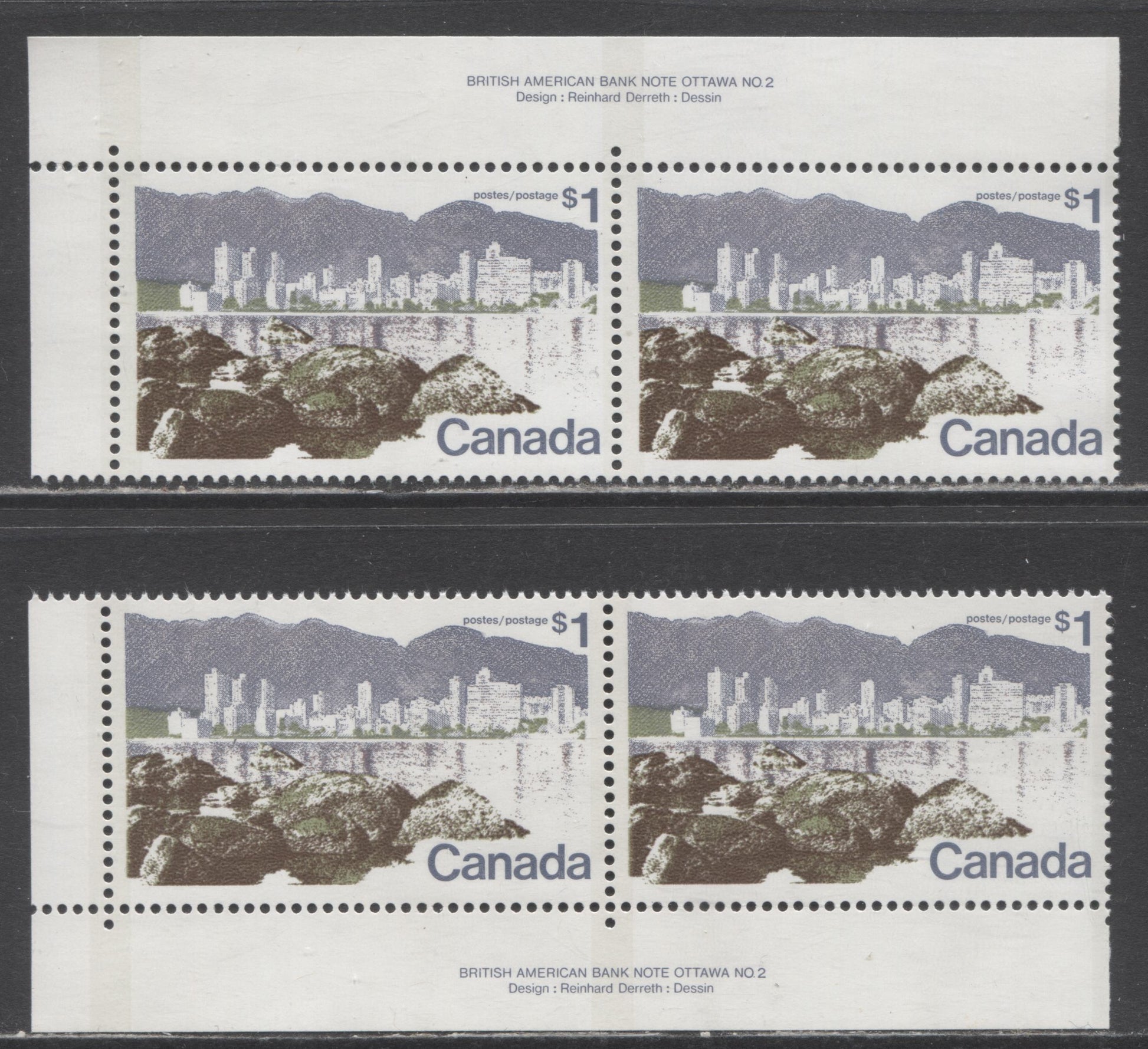 2 VFNH plate pairs of the $1 multicolored Vancouver from the 1972 Landscape Definitives. The lot includes:
