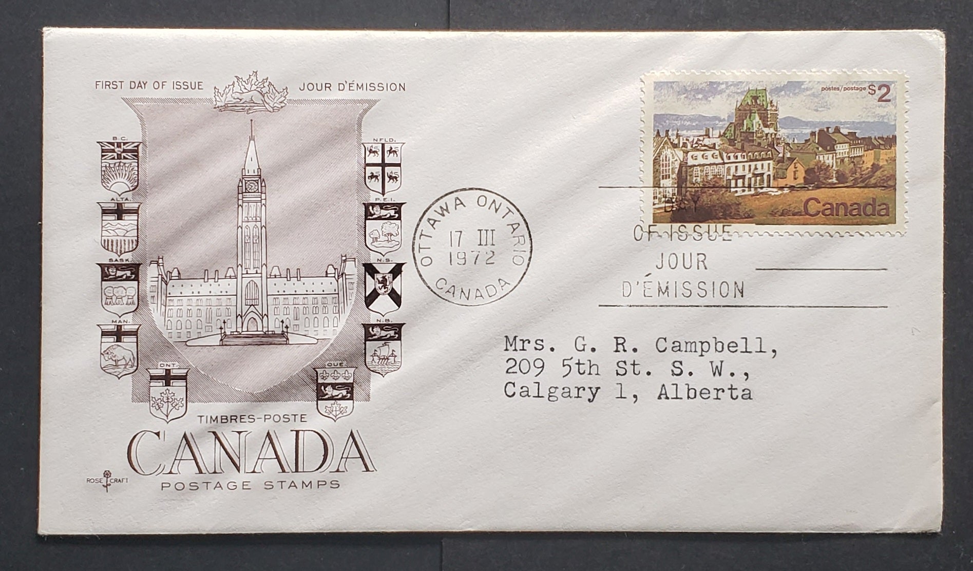 A VF Rosecraft type C FDC of the $2 multicoloured Quebec City from the 1972-1979 Landscape Definitive Issue franked with a single on LF paper, addressed.