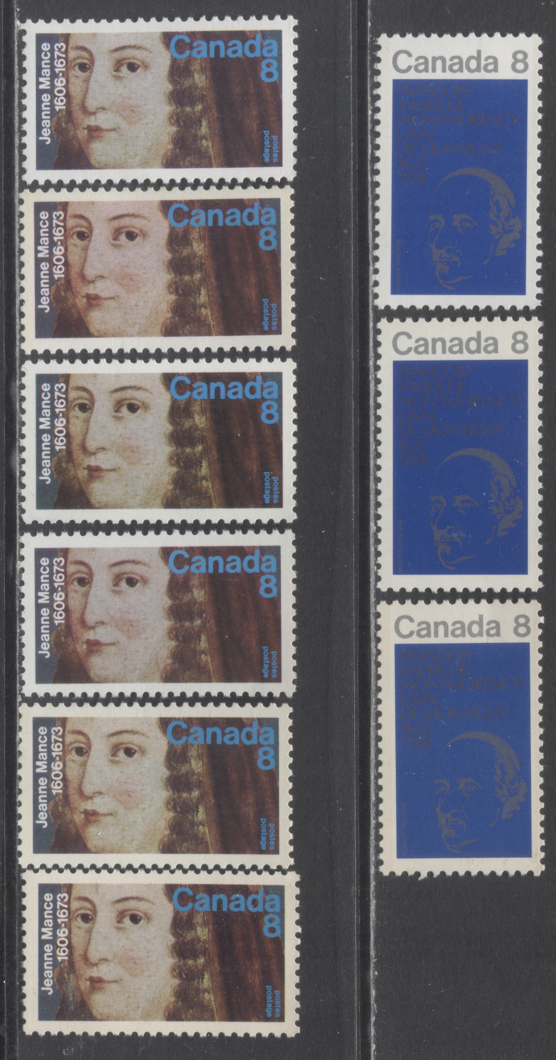 Canada #611, 615 8c Multicolored Bishop Laval & Jeanna Mance, 1973 Commemorative Issues, 9 VFNH Singles With Various Papers Including Scarce DF Faced Papers