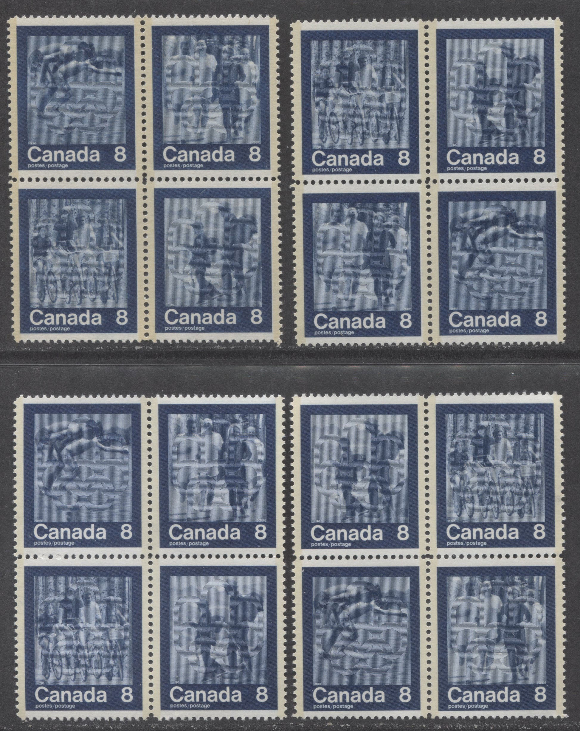 Canada #632a,ai 8c Dark Blue Swimming - Hiking, 1974 Keep Fit' Summer Sports Issue, 4 VFNH Blocks Of 4 On HB & NF Papers With Different Tagging & Gums