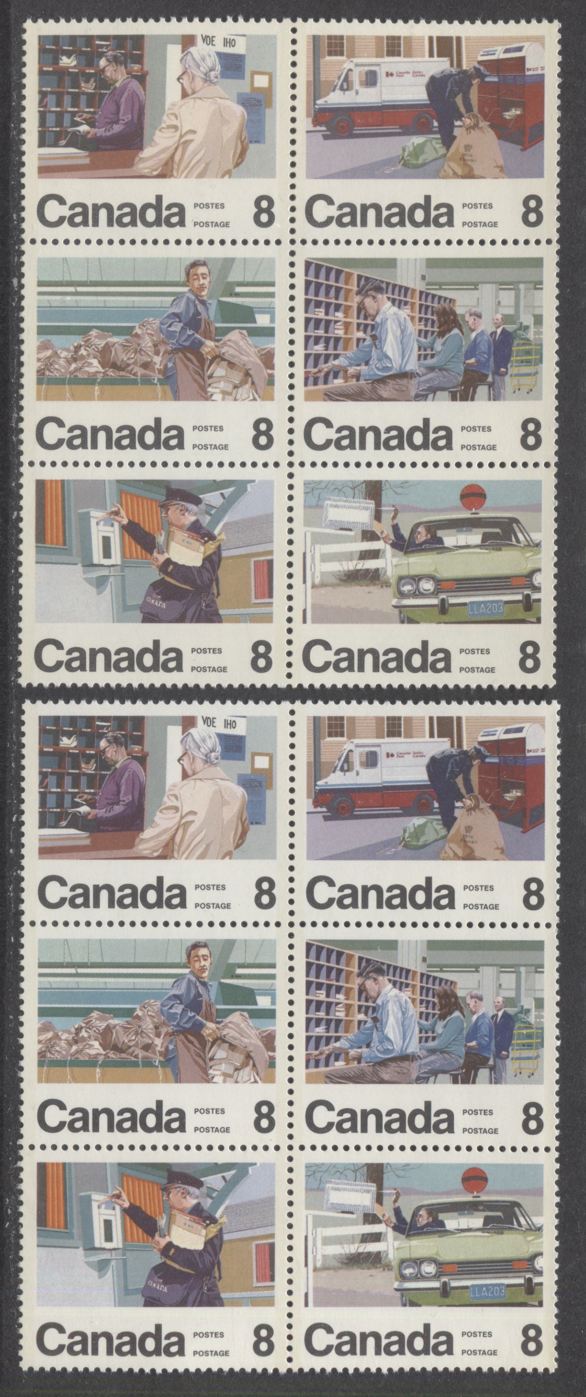 Canada #639a 8c Multicolored Postmaster - Rural Mail Courier, 1974 Letter Carrier Service, 2 VFNH Se-tenant Blocks Of 6 On MF Backed Mottled Paper With LF & F Fronts, Scarce