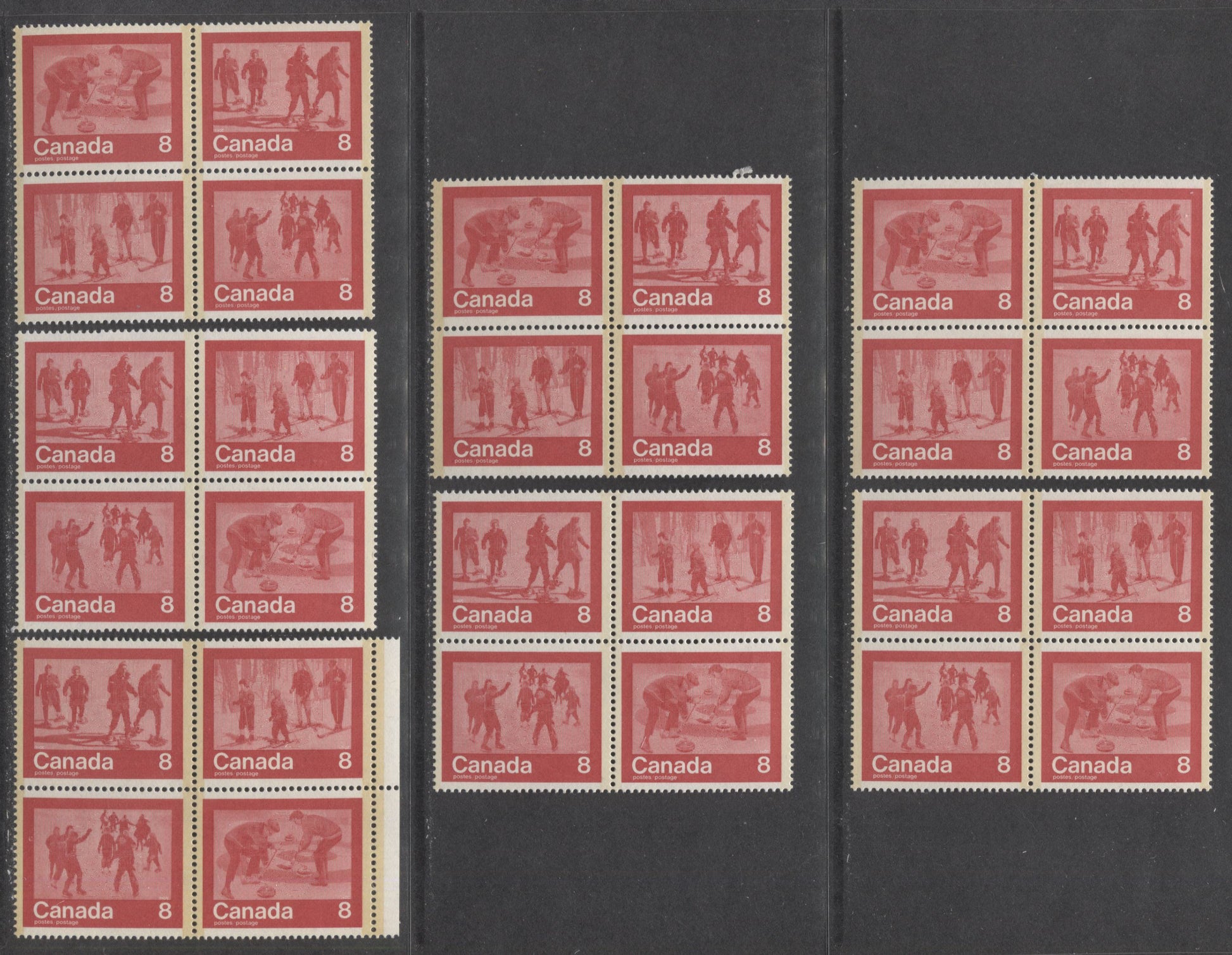 Lot 89 Canada #647a 8c Red Snowboarding-Curling, 1974 Keep Fit' Winter Sports Issue, 7 VFNH Se-tenant Blocks Of 4 On Various DF & LF Papers With Dark, Light & Moderate Tagging