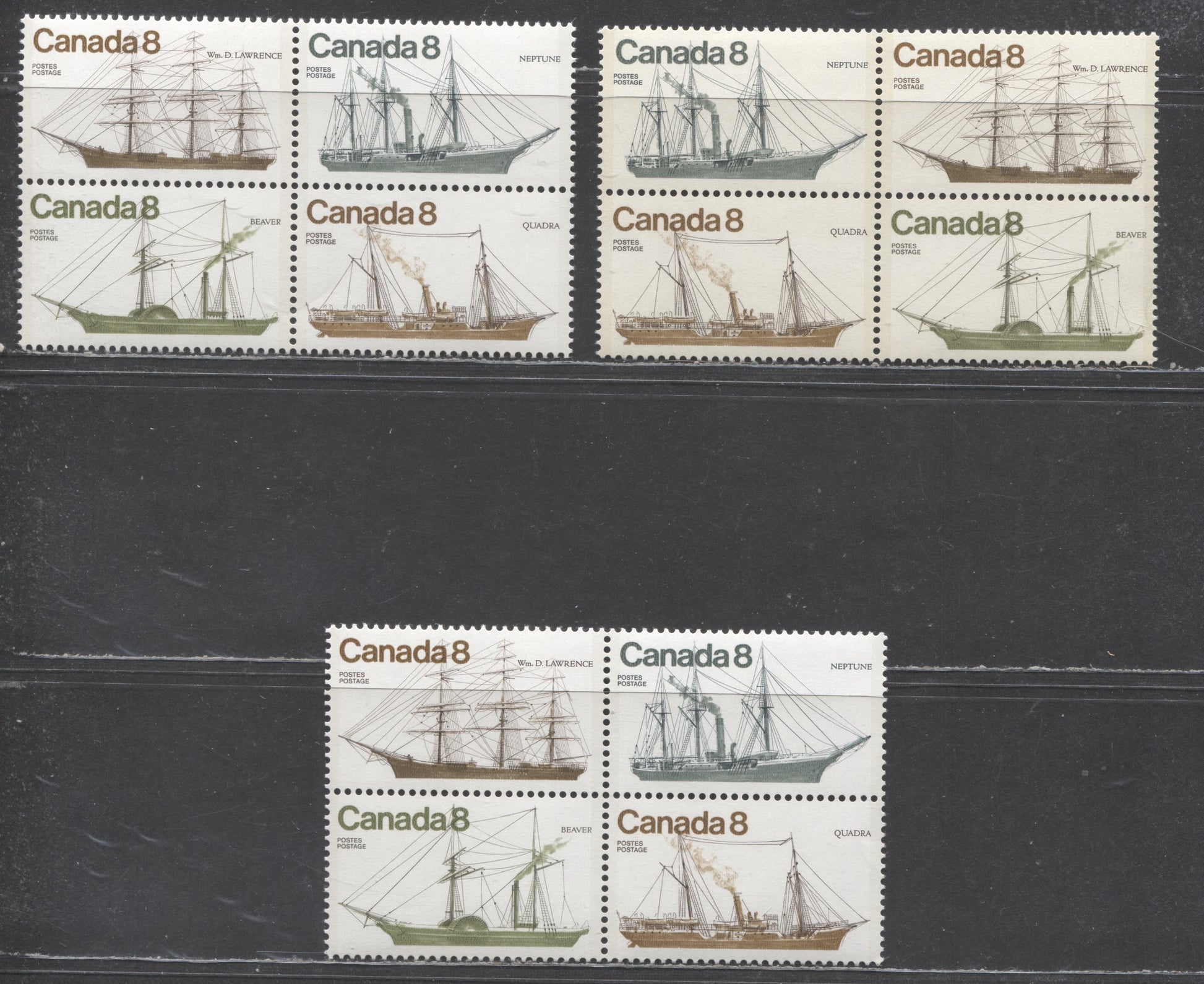 Canada #673aivar 8c Multicoloured 1975 Coastal Vessels, Three VFNH Se-tenant Blocks of 4 on DF/NF, DF/NF Cream Paper and DF/DF Paper