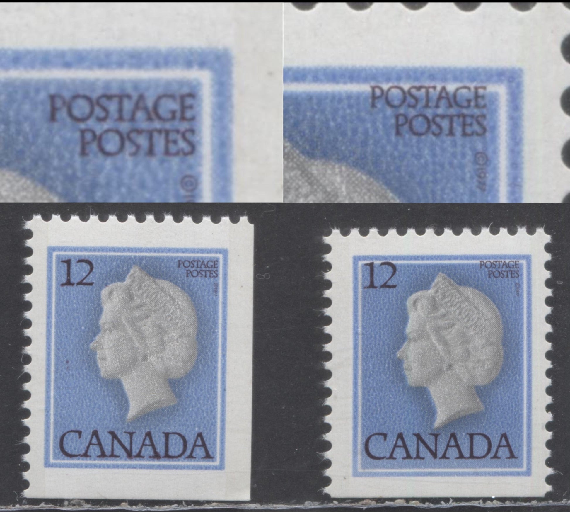 Canada #713a 12c Bright Blue & Black Queen Elizabeth II, 1977-1982 First Class Definitives, 2 VFNH Booklet Singles With Upward Shift Of Inscriptions With Normal, DF/DF Paper