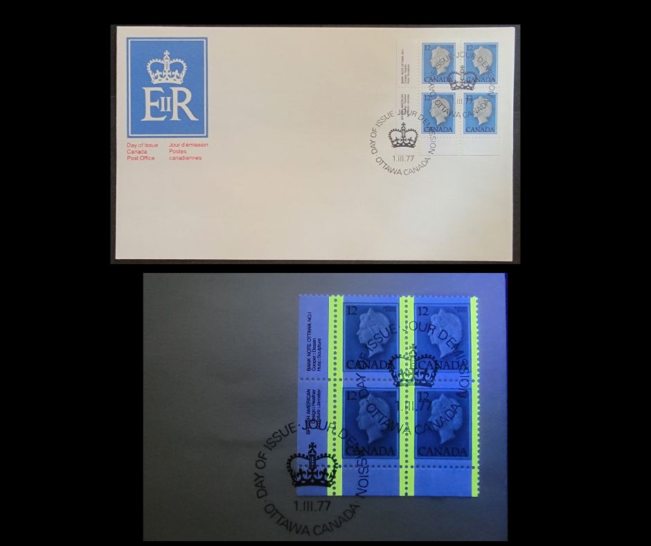 A VF Canada Post official FDC's of the 12c multicoloured Queen Elizabeth II & Parliament Buildings from the 1977-1985 Floral & Environment Issue franked with a LL plate block on MF/HF paper. The existence of this cover proves that this variation of paper was produced concurrantly with the more common DF paper. The DF envelopes appear to be the standard ones for these issues, with the fluorescent envelopes being less common. The fluorescence of the envelopes is an important characteristic that has been ignored by all the catalogues. Why does it matter? Because the envelope is an integral component of the FDC in the same way that a cover would be to a complete booklet, or the cardboard insert would be to a pack of plate blocks. The expectation, and general observation would be that Canada Post would utilize one type of envelope for a particular issue, so that if a different one from the standard type is found, then there is a good chance that it will be scarce, and is therefore, in our opinion collectible.