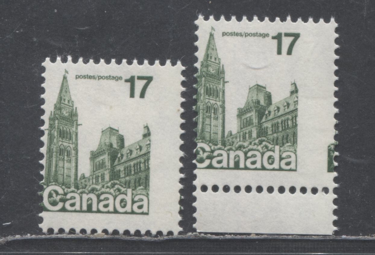 Lot 102 Canada #790iiivar 17c Dark Green Parliament Buildings, 1977-1982 Floral & Environment Issue, 2 Fine NH Singles On LF3/LF3 Paper, Showing Dramatic Misperfs, One Showing Portion Of Adjacent Design At Right