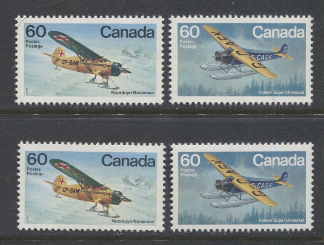 Canada #971-I, 972-i 60c Multicoloured Fokker Super Universal & Noorduyn Norseman, 1982 Bush Aircraft Issue, 4 VFNH Singles, DF/DF-fl and LF/F Papers