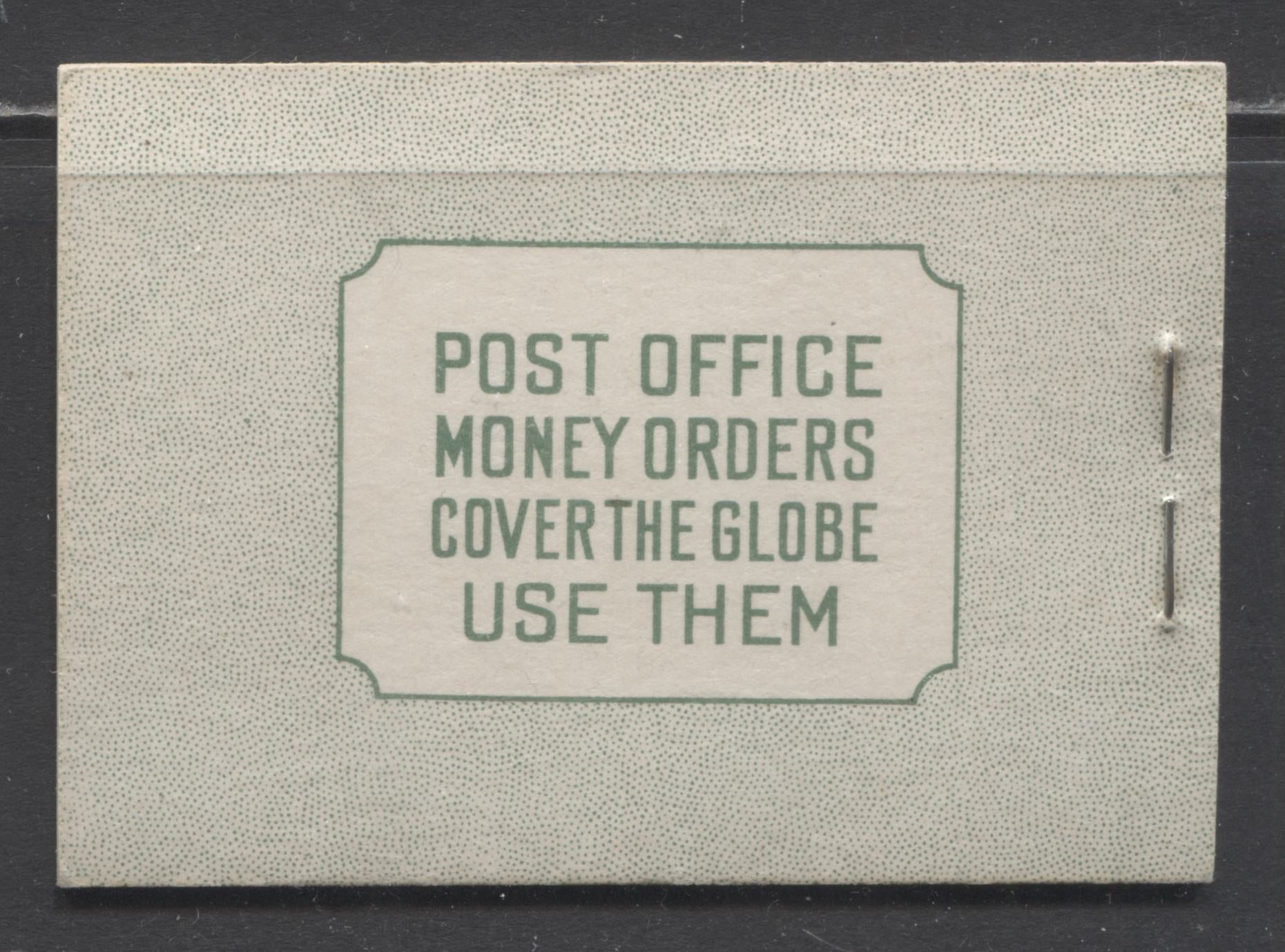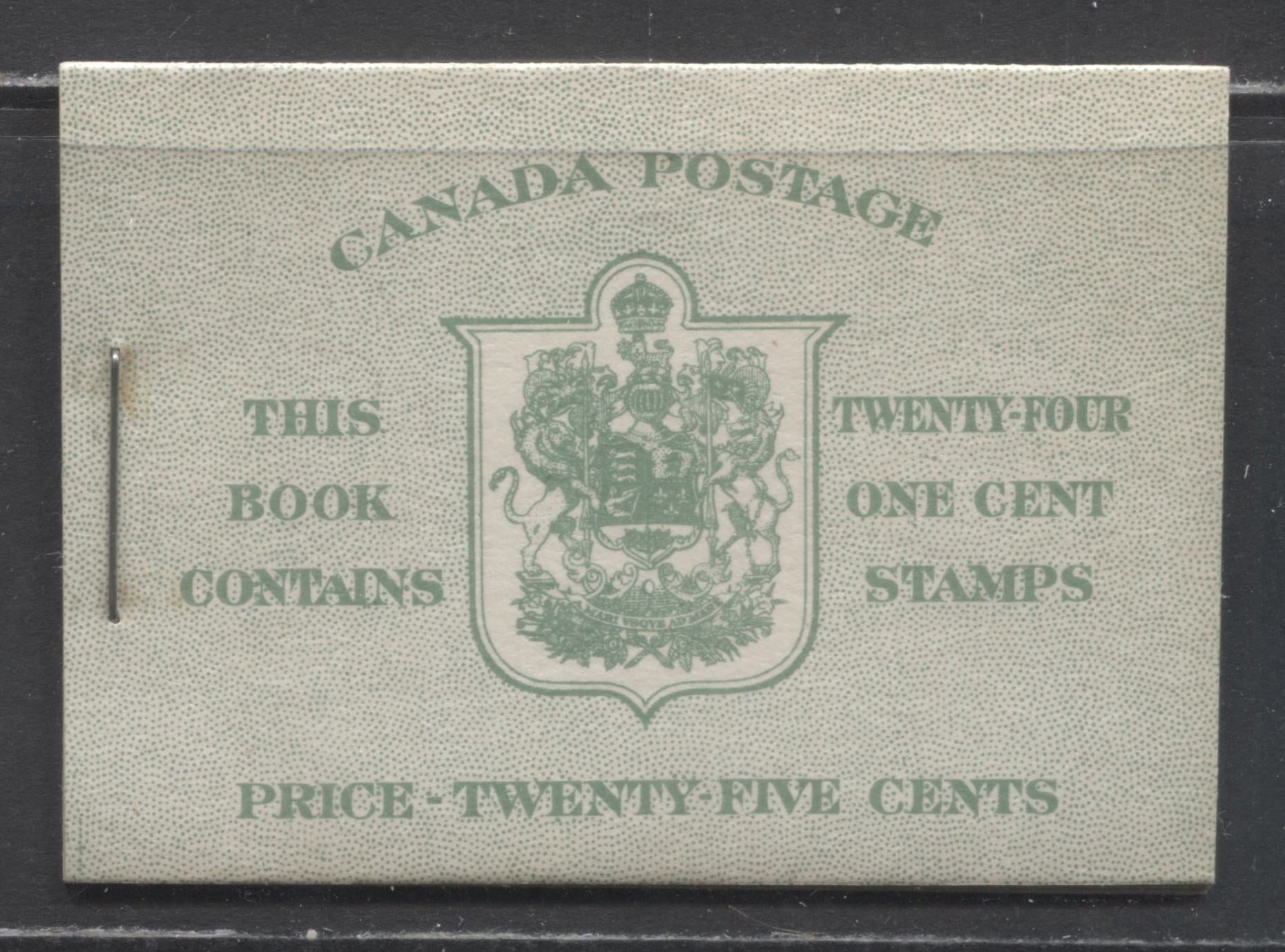 Lot 17 Canada #BK28cE 1937-1942 Mufti Issue, Complete 25c English Booklet, 4 Panes of 6 1c Green, 6c Rate Page, 17 mm Staple, Cutting Guideline LL Of Front Cover, Vertical Ribbed Paper, Type 2 Covers, Harris Front Cover Type IIB