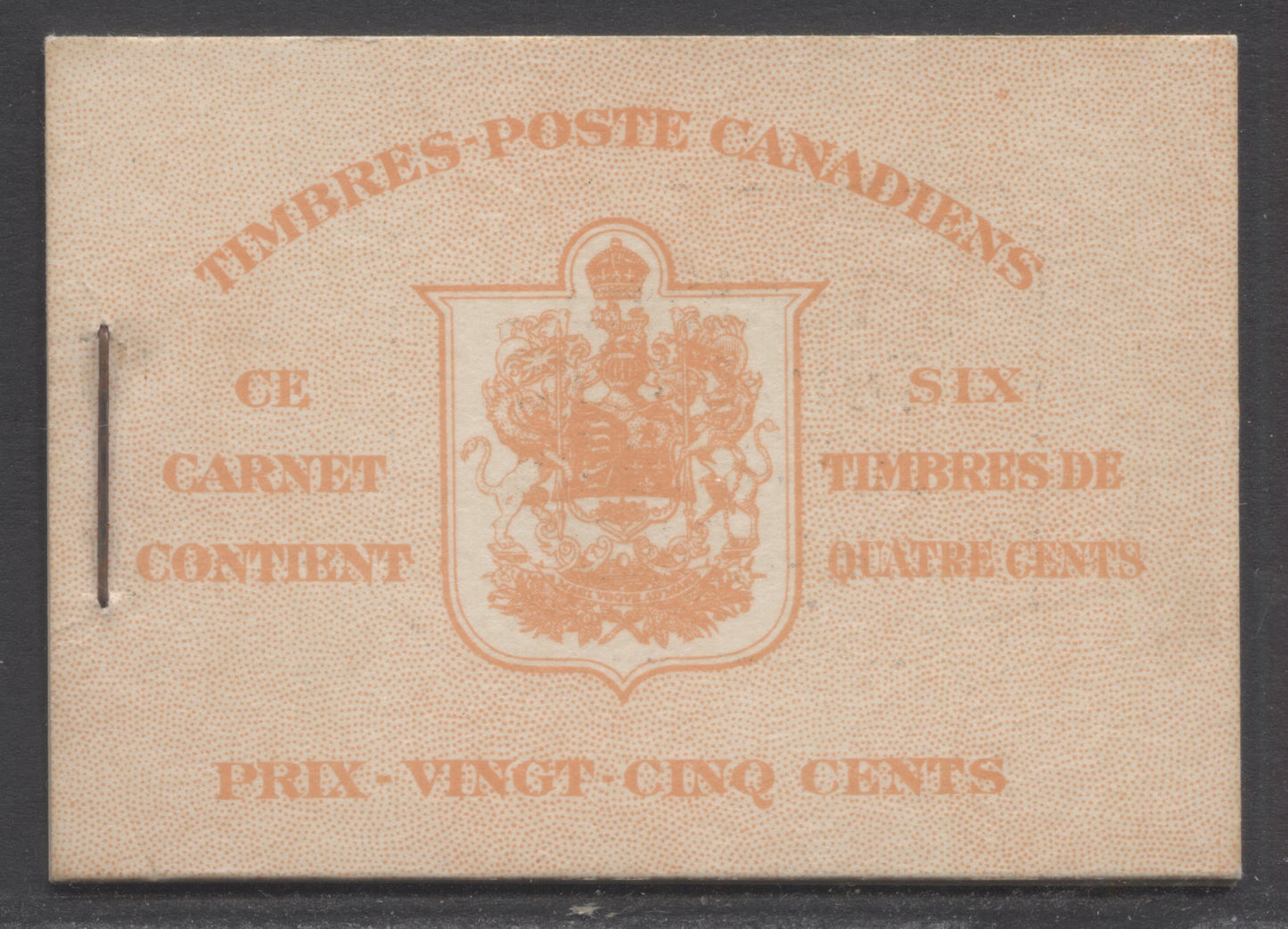For the booklets from this issue, the quantities issued refer to the total number of booklets issued for all rate page types, all staple sizes and all Harris front and back cover types for a particular denomination of booklet in English or French. They come from the McCann catalogue, which does not break the quantity down into the individual varieties. Consequently, depending on how many listed types there are, many of these booklets are much, much scarcer than the overall issue quantities would suggest. For example, according to McCann, there were 699,000 English 25c booklets containing four panes of 6 1c green stamps issued. However, there were seven different basic rate-page and cover type combinations, not counting the Harris sub-types. If they were more or less evenly distributed among these types, that is just under 100,000 of each type, and then this gets broken down further into between 2 and 8 Harris sub-types each. So, this places these issue quantities into a more accurate perspective.
