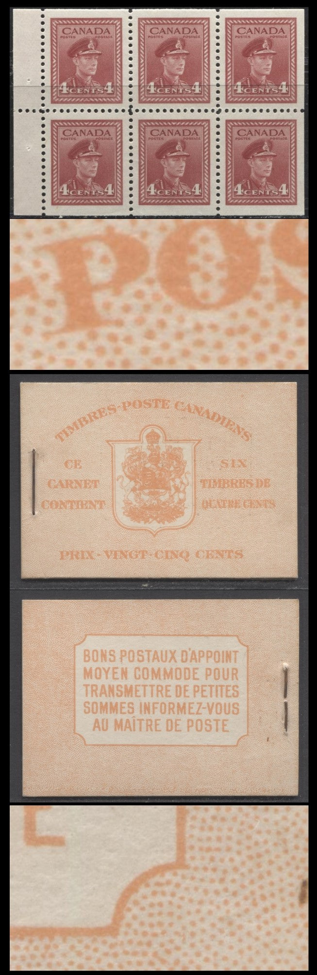 Canada #BK36dFIIsDiii 1942-1947 War Issue, A Complete 25c French Booklet, A Pane Of 6 4c Dark Carmine, Front Cover IIs, Back Cover Diii, Type II, 7c & 6c Rate Page, Horizontal Ribbed Pane, 1,789,000 Issued