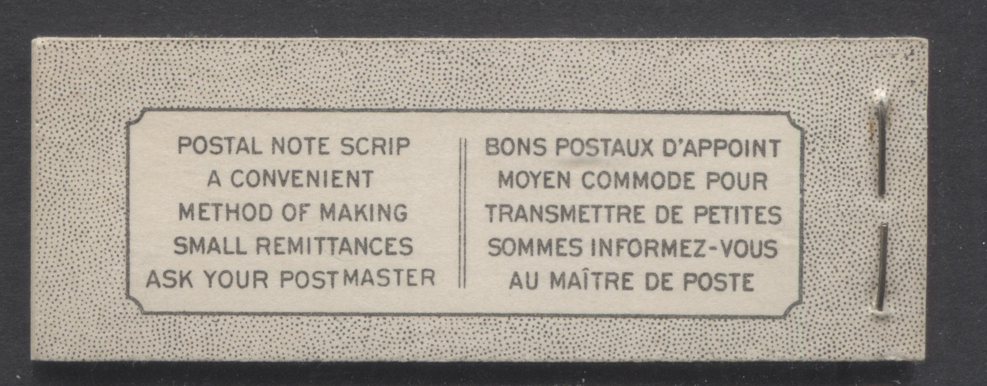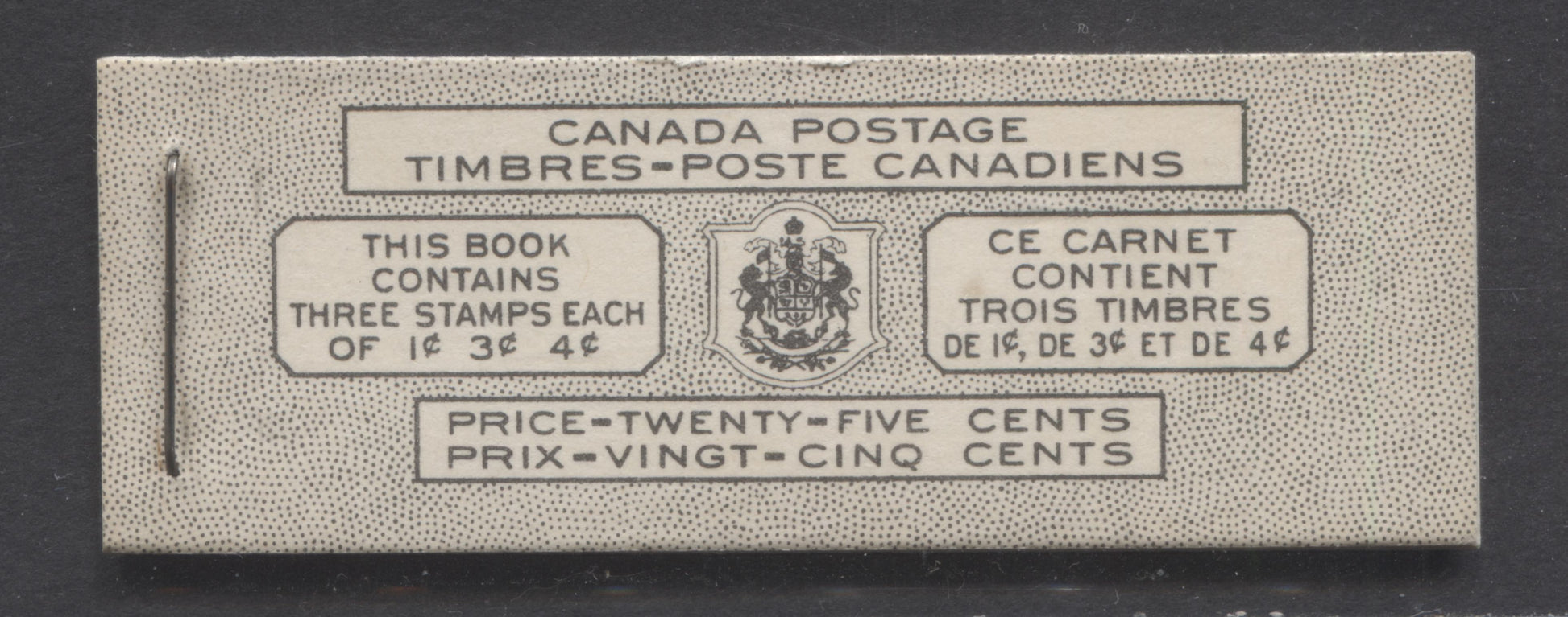 A complete 25c Bilingual booklet from the 1949-1951 KGVI Issue with 1c green, 3c rose violet & 4c dark carmine, panes of 3. Front cover VIi, back cover Kavii, type i cover. 7c & 5c rates. 332,950 issued. Unitrade values this booklet at $60.