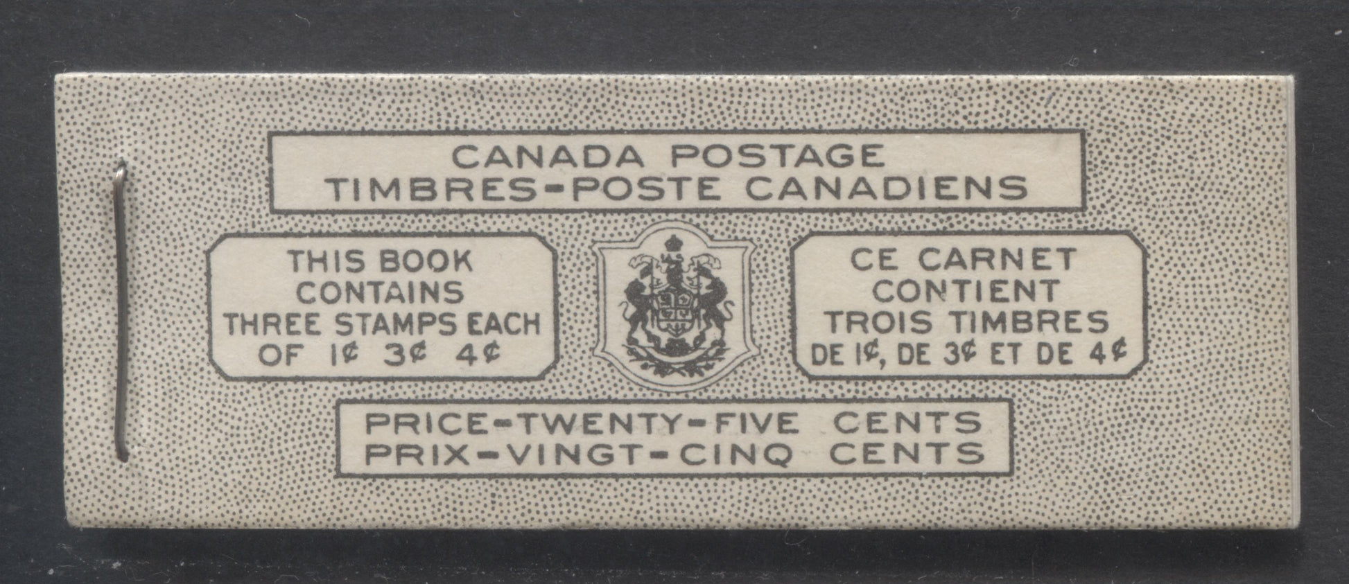 A complete 25c Bilingual booklet from the 1949-1951 KGVI Issue with 1c green, 3c rose violet & 4c dark carmine, panes of 3. Front cover VIl, back cover Kaxi, type i cover. 7c & 5c rates. 332,950 issued. Unitrade values this booklet at $60.