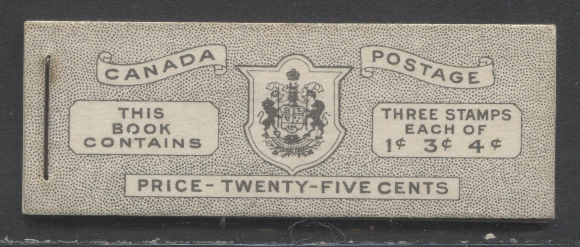 A complete 25c English booklet from the 1949-1951 KGVI Issue with 1c green, 3c rose violet & 4c dark carmine, panes of 3. Front cover IVa, back cover Iiv, type II cover. No rate page. 914,500 issued. Unitrade values this booklet at $42.