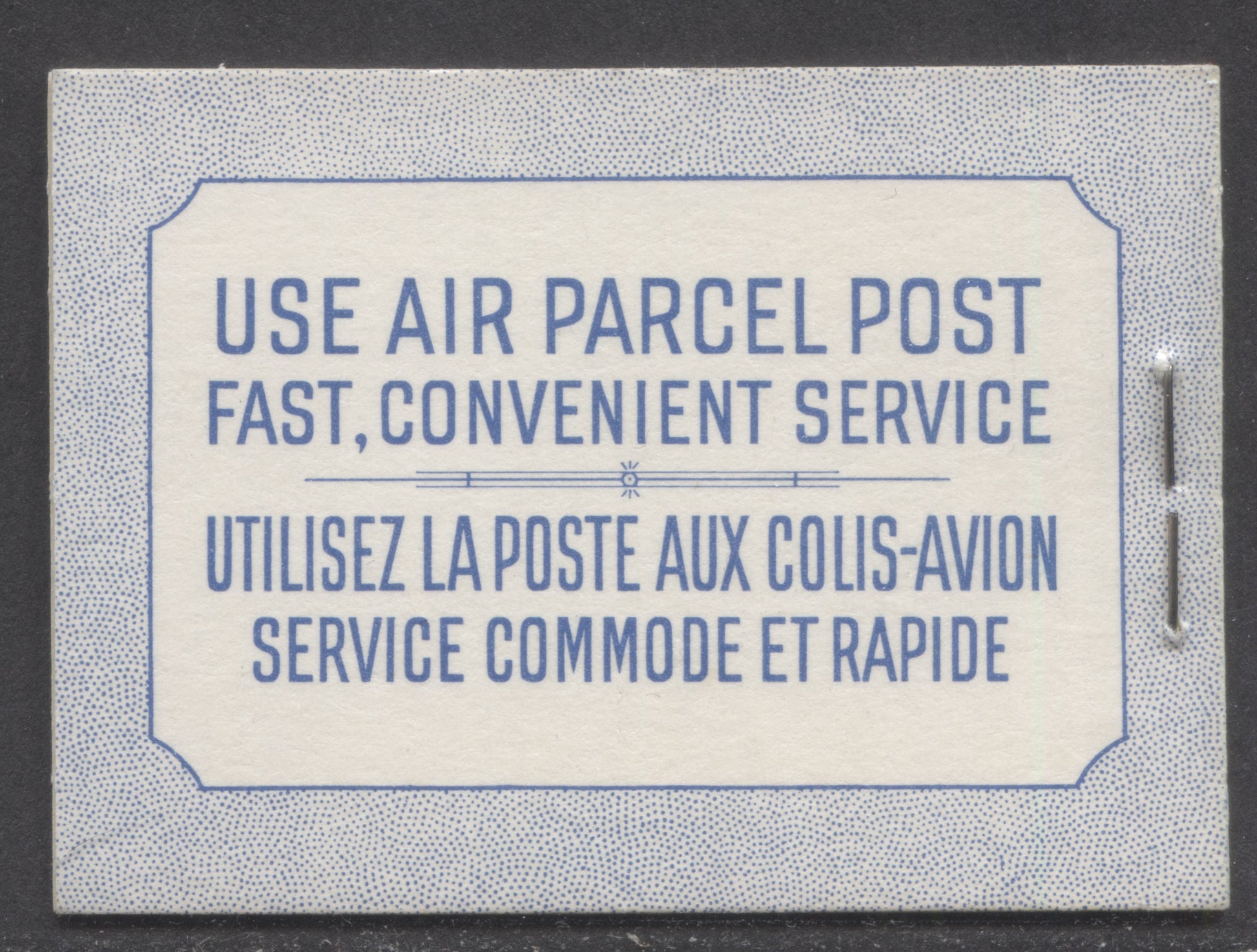 A complete 25c Bilingual booklet from the 1954 Wildlife Issue, with 5c blue, one pane of 5+label. Front cover IIIh, back cover Mi, type II cover. Break in text box at LL & dot to UR of arms & dot in inner line of shield. Our best estimate of the value of this booklet is $10.