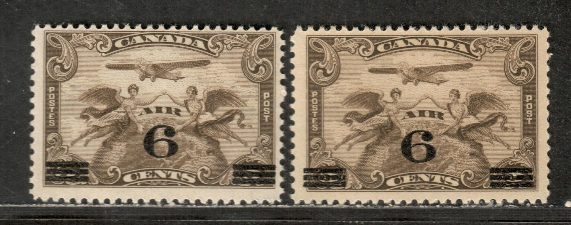 Canada #C3 5c Deep Olive Brown & Olive Brown Winged Figures Against Globe, 1932 Air Mail Issue, 2 FNH Singles With Streaky Gum