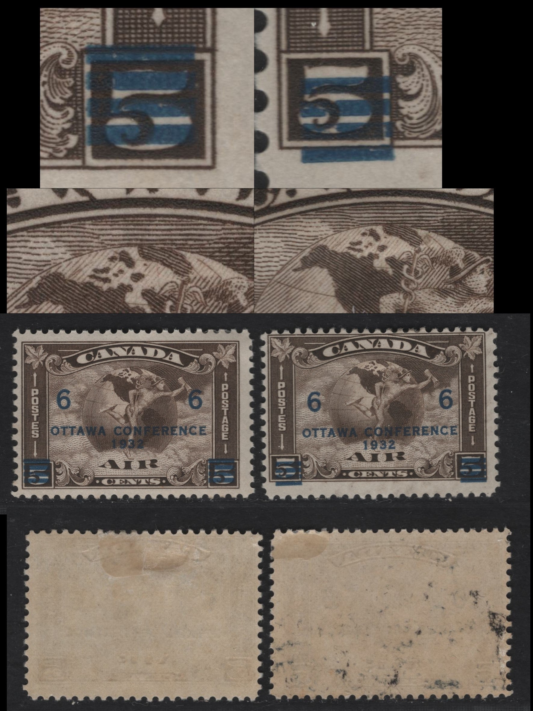 2 fine OG singles of the 6c on 5c olive brown Mercury & Globe from the 1932 Ottawa Economic Conference Issue extra island off Greenland, semi-gloss cream gum, surchage shifted both left & right, semi-gloss cream gum. In both these examples, the surcharge is displaced a full milimetre to the left and right of the numeral box, which it ideally should be covering, and which it does on the vast majority of the stamps. This extra island variety reappears on very many stamps as well as the variation without the extra island. The extra island, when it does appear , is always in more or less the same place. This strip shows that both varieties occur on the same sheet, and suggest that they are two different types of the same design. This shows that the variety does not always alternate with the non-variety stamp, but can occur on subesequent stamps.