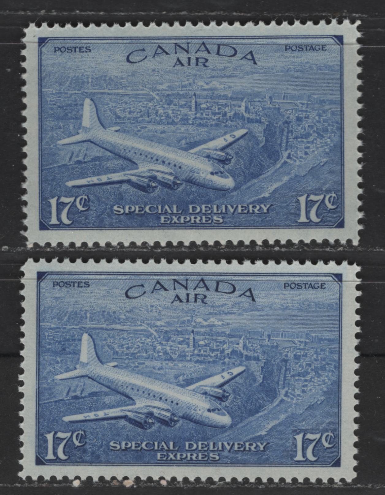Lot 110 Canada #CE3-CE4 17c Ultramarine DC 4-M Airplane, 1946-1952 Peace Issue Airmail Special Delivery, 2 VFNH Singles With Streaky & Mottled Cream Gum On Vertical Wove Paper With Horizontal Mesh