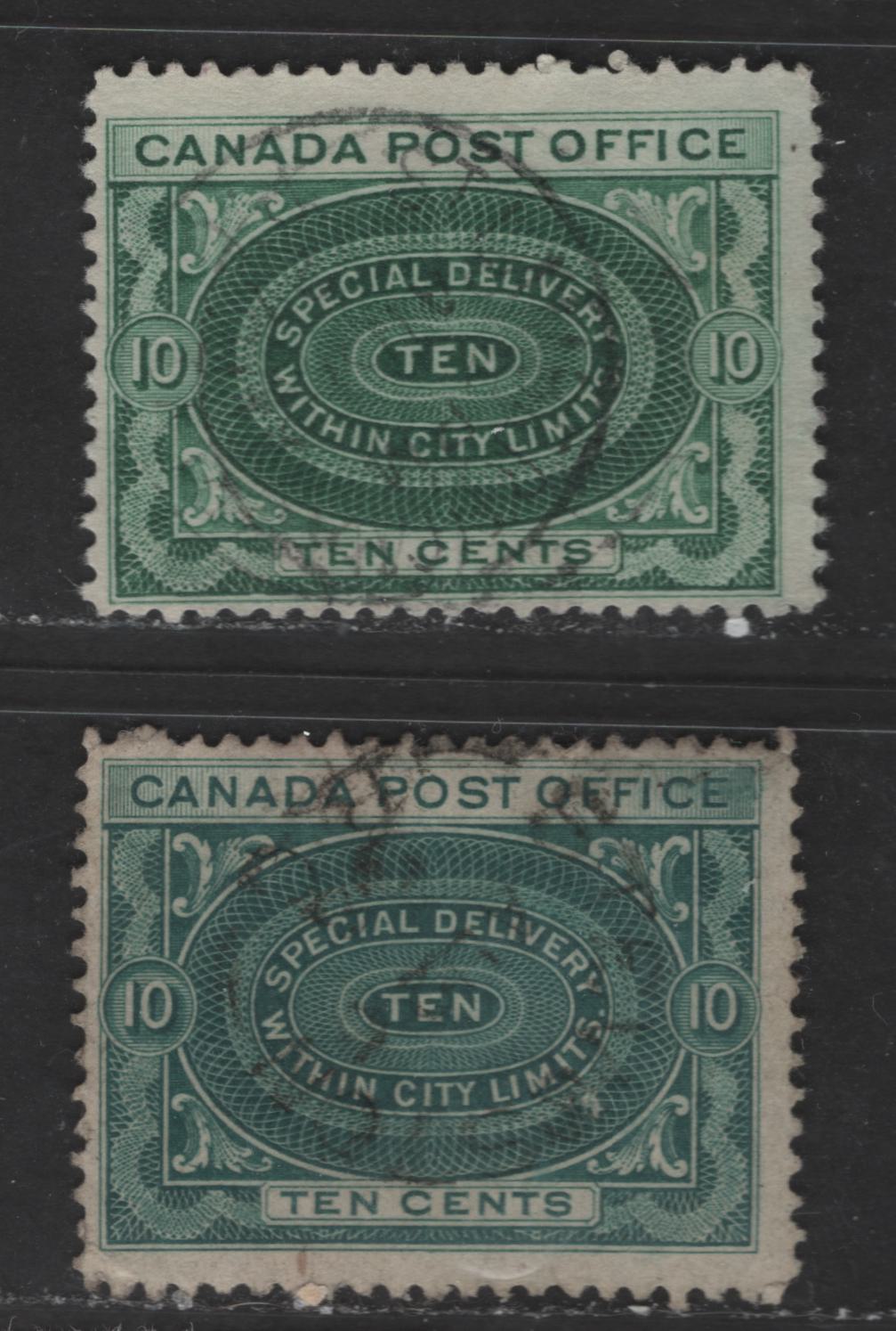 Lot 111 Canada #E1ii, E1iv 10c Green & Deep Blue Green Engine Turned Pattern, 1898-1920 First Special Delivery Issue, 2 Fine Used Singles On Horizontal & Vertical Wove Paper, No Diagonal Shading In Value Tablet On Green Stamp